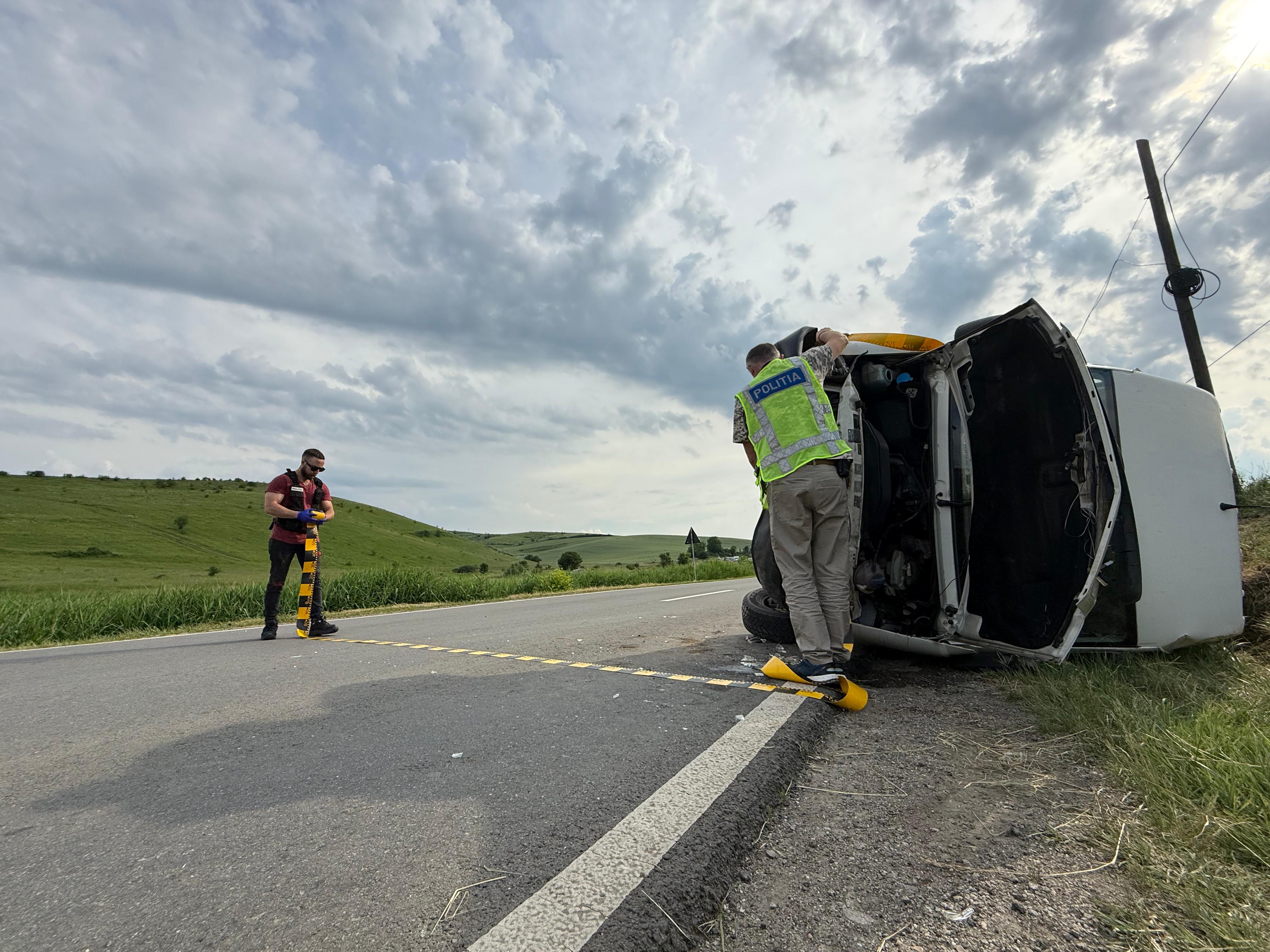 Accident în această după-masă, o autoutilitară s-a răsturnat.