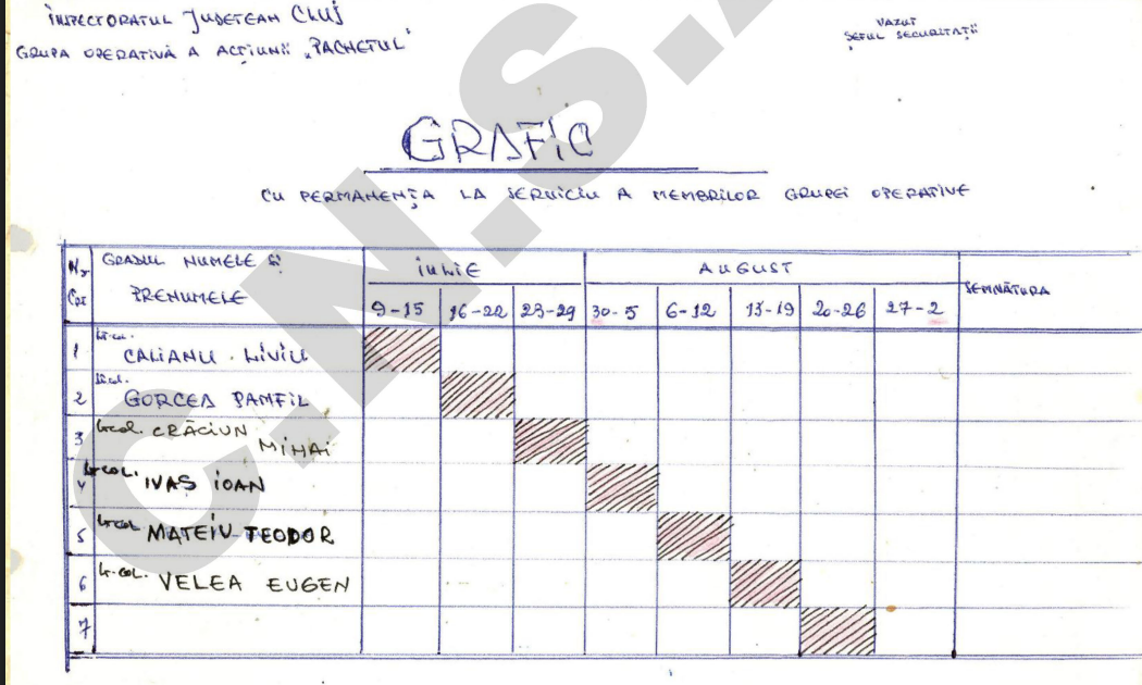 Ancheta nu a fost condusă de la Sfântu Gheorghe, ci de la Cluj-Napoca. La 14 iulie 1984, Inspectoratul Județean Cluj al Ministerului de Interne întocmea un Plan de Măsuri clasificat Strict Secret, aprobat de un colonel cu semnătură indescifrabilă. Șeful grupei operative constituite special pentru caz era Lt. col. Oprea Florian, secondat de șase ofițeri: Lt. col. Velea Eugen, Lt. col. Vulcan Filițaș, Maior Chicinas Alexandru, Lt. col. Soptereanu Augustin, Lt. col. Gorcea Pamfil și Lt. col. Ermalai Averian. Grupa se coordona permanent cu Comandamentul acțiunii din Sfântu Gheorghe, gestiona întreaga corespondență operativă și urma să completeze planul săptămânal, în funcție de evoluția situației.