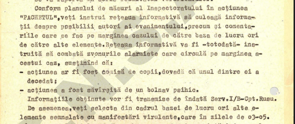 Un tabel clasificat Strict Secret — Exemplar unic, datat august 1984, consemna rețeaua de șapte informatori mobilizați de Inspectoratul Cluj în acțiunea „Pachetul”. Aceștia operau sub nume conspirative — „Kiss” (preot reformat), „Bibliotecarul”, „Sandor” (profesor), „Mirlos Mozses” (profesor), „Bartha Lajos” (conferențiar universitar), „Rusz Peter” (ziarist) și „Bokor” (student la medicină). Informatorii cu rude sau relații în Sfântu Gheorghe urmau să fie trimiși fizic în zonă pentru a culege date și a combate zvonurile „alarmiste” care circulau în jurul cazului.