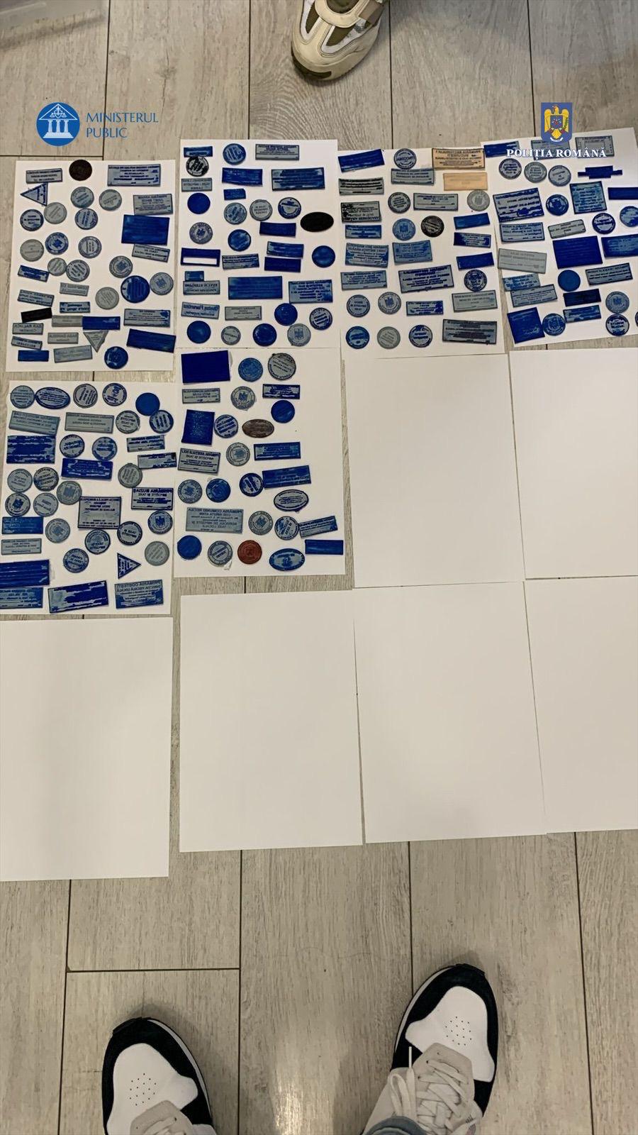 La percheziții au fost găsite între altele ștampile și matrițe aferente unor instituții publice din mai multe județe – 24 de ștampile și nu mai puțin de 228 de matrițe, bunuri interzise la deținere, o armă neletală, precum și sume importante de bani.