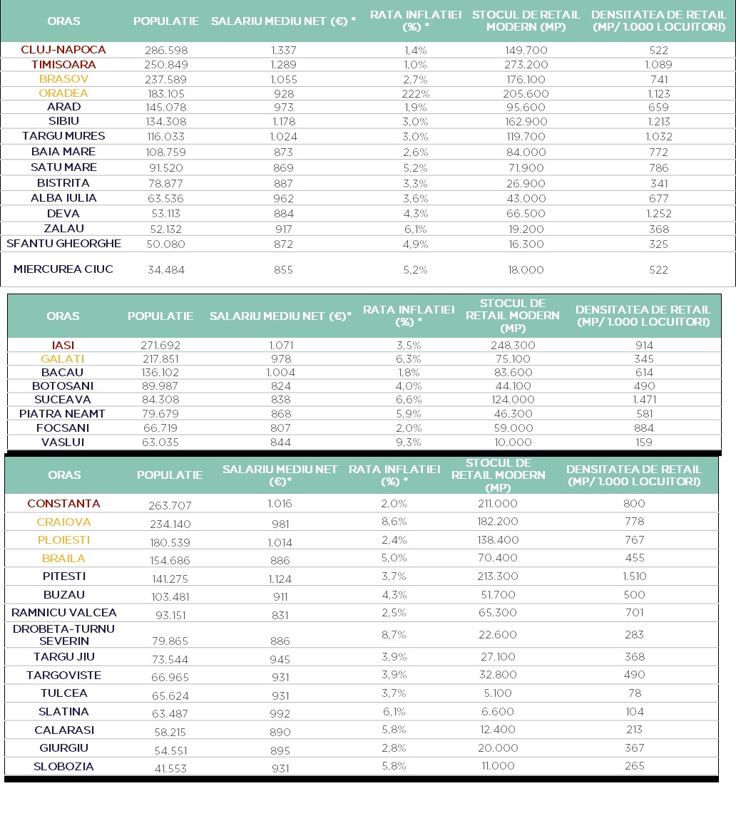 Astfel, la nivel de oraș, localitățile cu cea mai mare densitate de spații comerciale sunt Pitești (1.510 mp/ 1.000 locuitori), Suceava (1.471 mp/ 1.000 locuitori), Deva (1.252 mp/ 1.000 locuitori), Sibiu (1.213 mp/ 1.000 locuitori), Oradea (1.123 mp/ 1.000 locuitori) – orașe cu până la 150.000 de locuitori și Timișoara (1.089 mp/ 1.000 de locuitori) – oraș cu o populație de peste 250.000 de locuitori. În celelalte orașe cu peste 250.000 de locuitori acest indicator variază între 522 mp/ 1.000 de locuitori în Cluj-Napoca și 914 mp/ 1.000 de locuitori în Iași. Raportul din Cluj-Napoca este cel mai mic dintre toate orașele mari din România, exceptând Constanța.