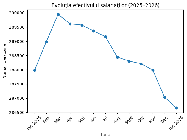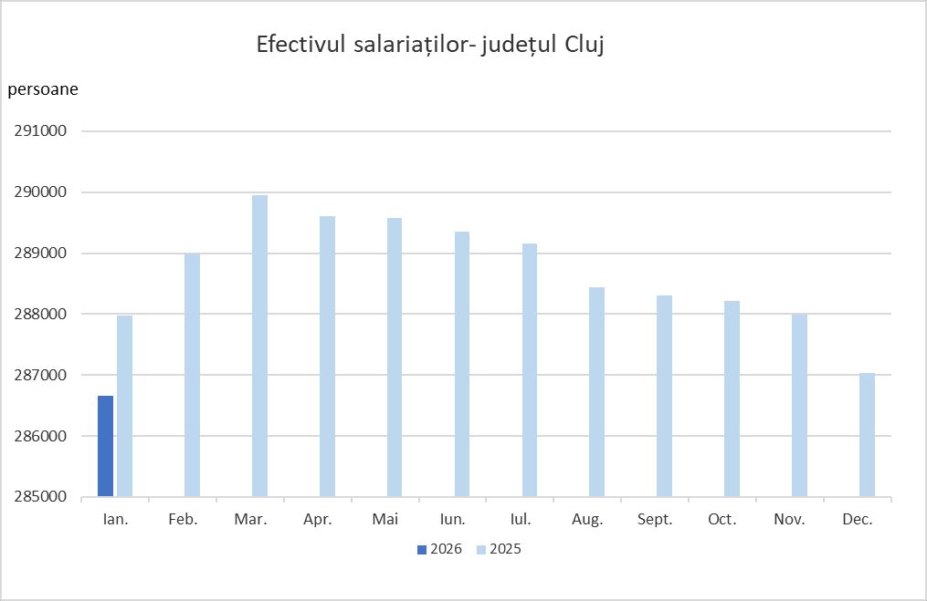 Potrivit datelor publicate de Direcția Județeană de Statistică Cluj, efectivul salariaților din județ a coborât în ianuarie 2026 la 286.660 de persoane — cu 1.316 mai puțin față de ianuarie 2025. Față de vârful absolut înregistrat în martie 2025, când în județ lucrau 289.947 de salariați, scăderea cumulată ajunge la 3.287 de persoane.