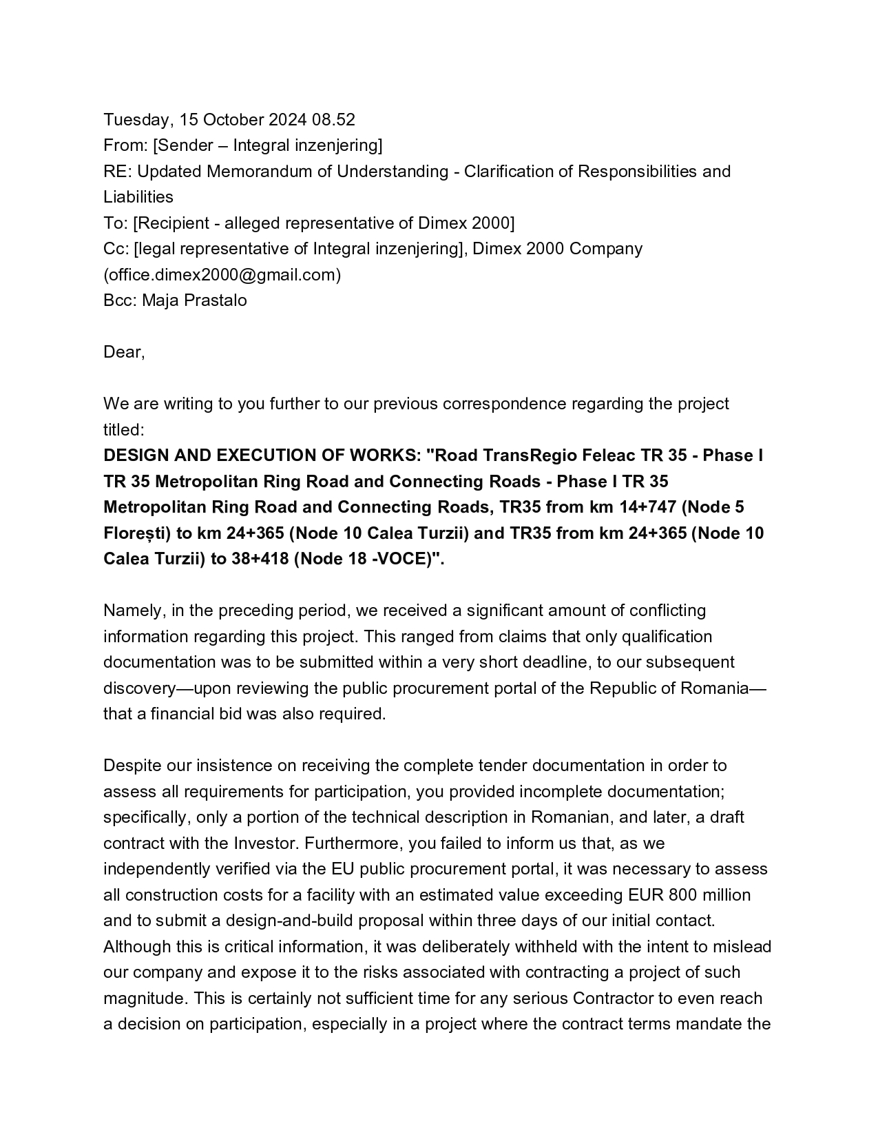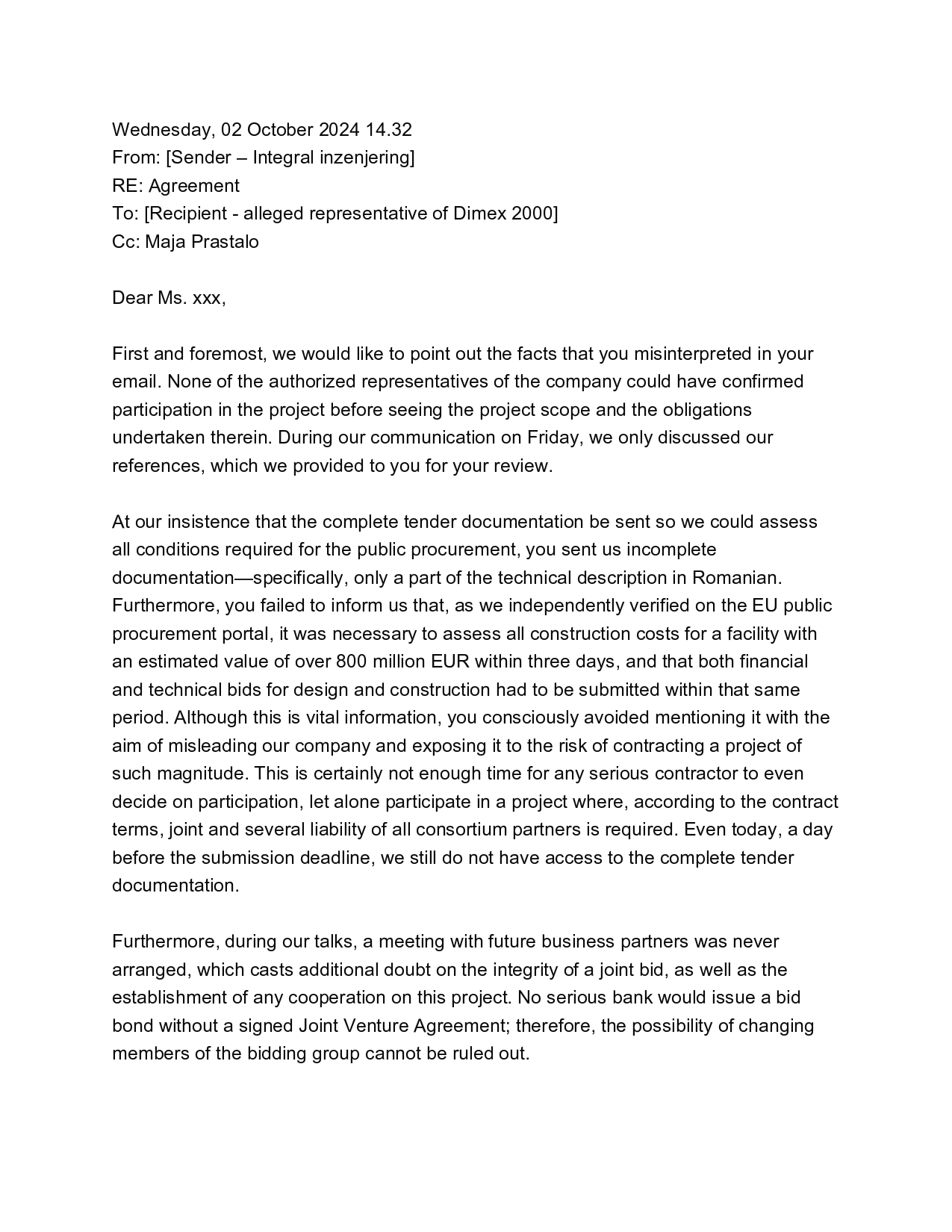 În al doilea email (datat 15 octombrie 2024) detaliem suplimentar motivele respingerii și menționăm că presupuşii reprezentanți ai Dimex 2000 au continuat să transmită – mai întâi nesemnat, apoi semnat – un Acord de Asociere (Joint Venture Agreement), în pofida explicațiilor oferite la 2 octombrie 2024. Reiterăm că nu dorim să participăm la nicio fraudă sau încălcare a legislației UE și declinăm din nou orice răspundere pentru eventuale prejudicii.