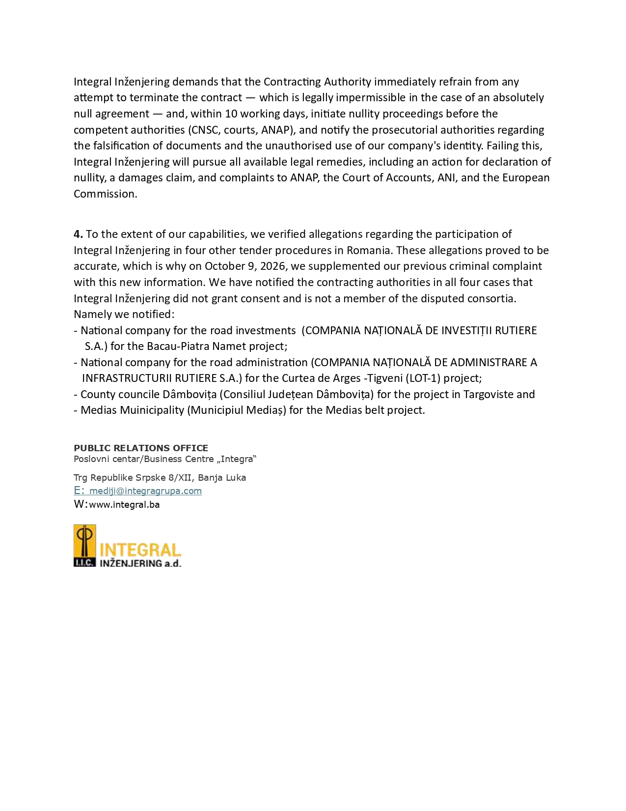 - În limita posibilităților, compania a verificat și informațiile privind participarea sa în alte patru proceduri de achiziție publică din România. Aceste suspiciuni s-au confirmat, motiv pentru care, la 9 octombrie 2026, a fost completată plângerea penală anterioară cu noile informații. Autoritățile contractante din toate cele patru cazuri au fost notificate că Integral Inženjering nu și-a dat acordul și nu este membru al asocierilor respective.