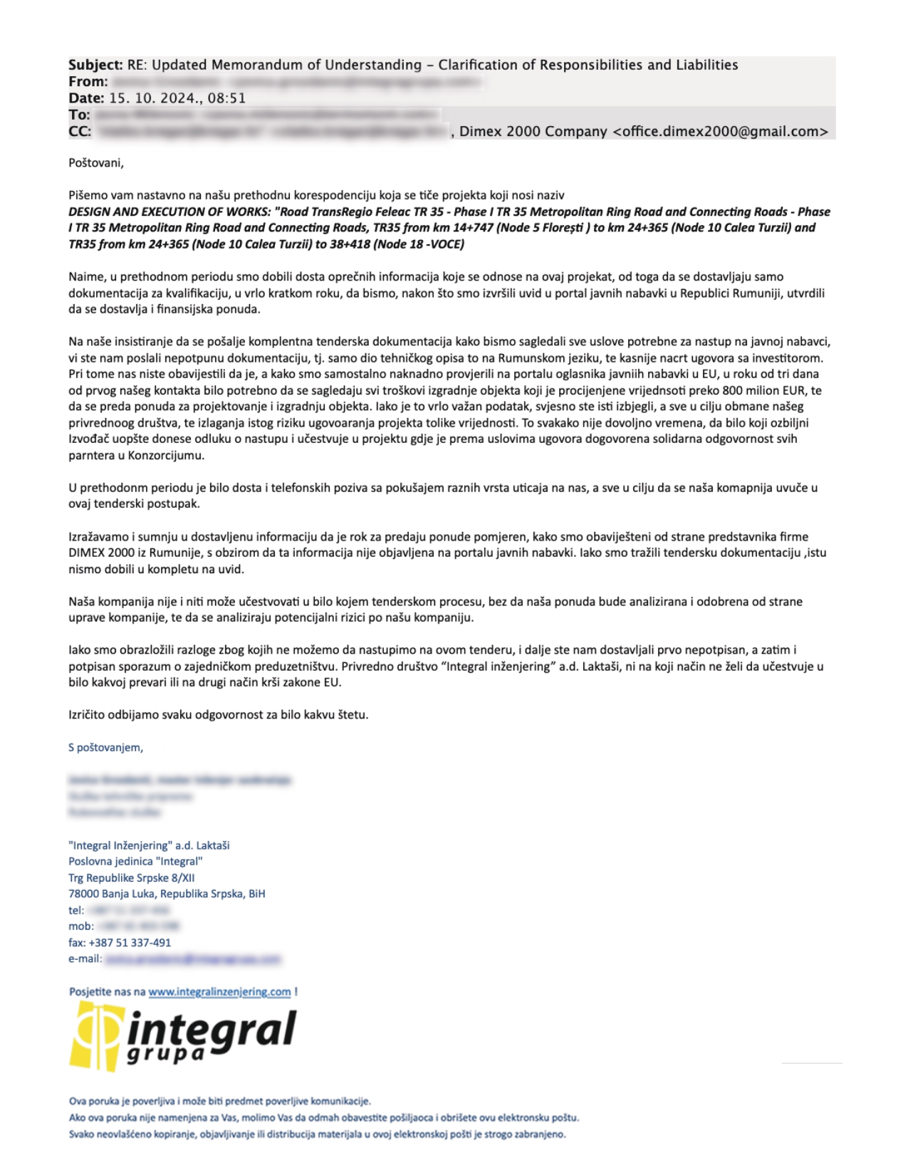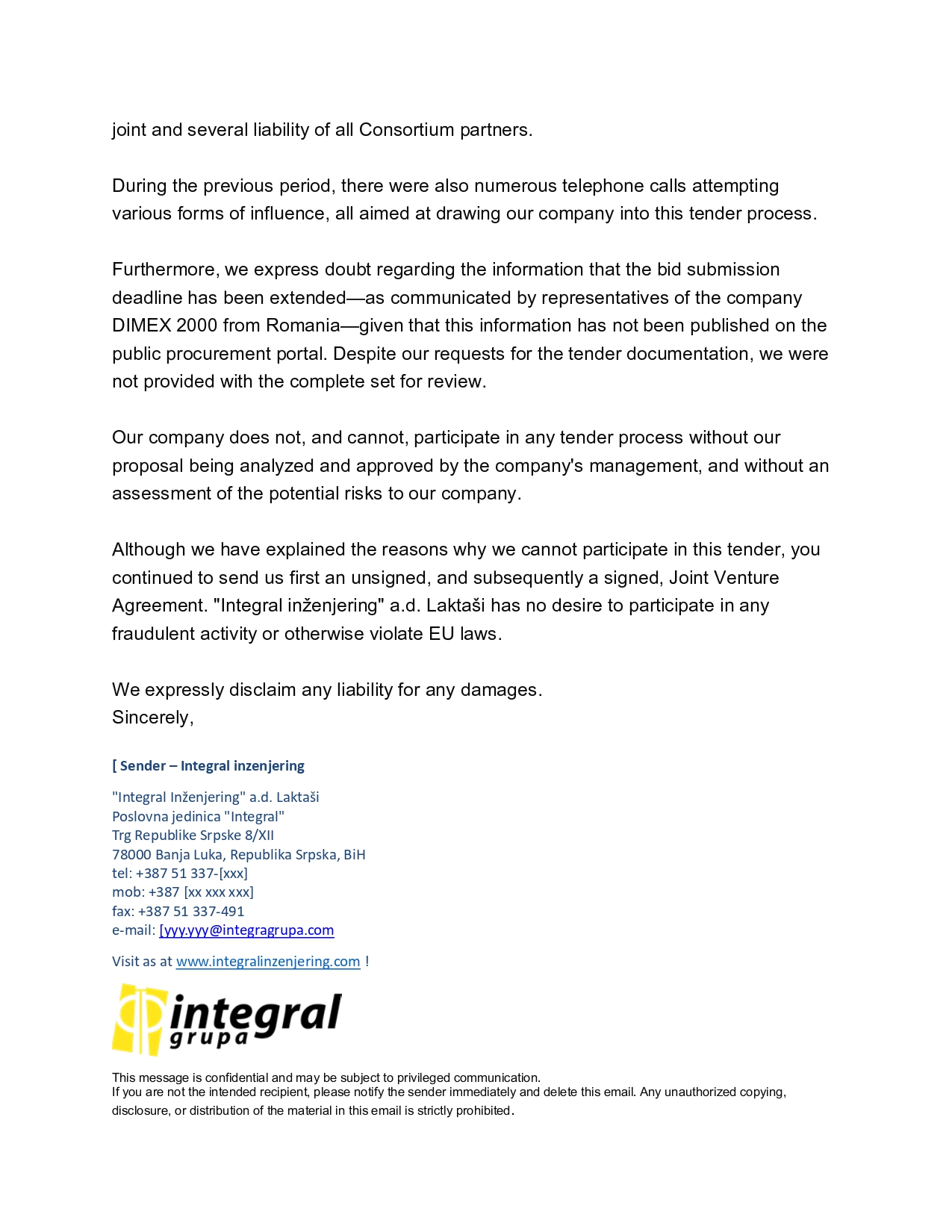 „Ca urmare a numeroaselor solicitări identice sau similare primite din partea presei din România, transmitem prin prezenta două emailuri prin care am respins propunerea de parteneriat cu Dimex 2000 (atașate), precum și o actualizare privind demersurile întreprinse de Integral Inženjering a.d. Laktaši după ce am constatat că identitatea companiei a fost folosită abuziv în alte patru proceduri de achiziție publică.