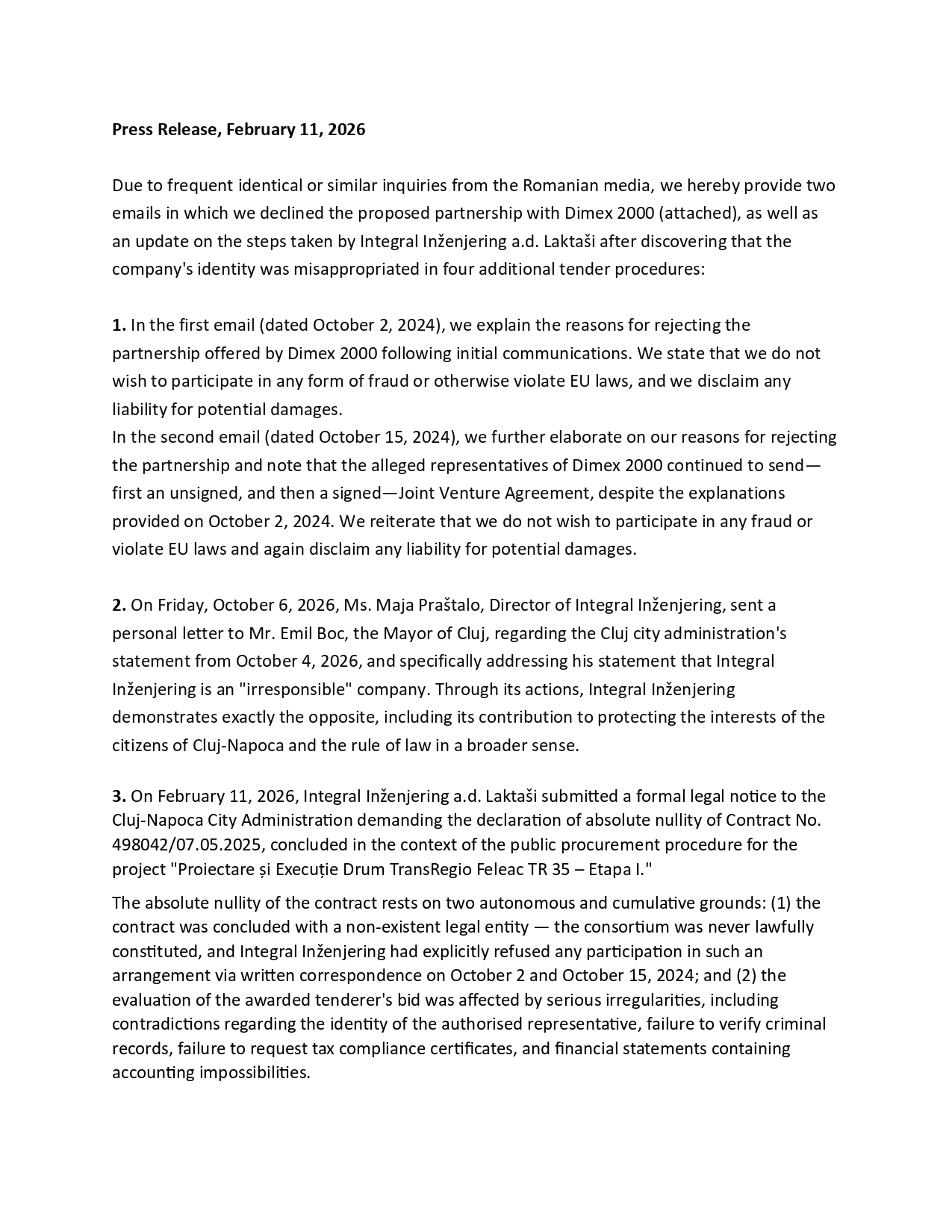 - Vineri, 6 octombrie 2026, doamna Maja Praštalo, director al Integral Inženjering, a transmis o scrisoare personală domnului Emil Boc, primarul municipiului Cluj-Napoca, referitoare la declarația administrației locale din 4 octombrie 2026, adresând în mod special afirmația potrivit căreia Integral Inženjering ar fi o „companie iresponsabilă”. Prin acțiunile sale, Integral Inženjering a demonstrat exact contrariul, inclusiv prin contribuția la protejarea intereselor cetățenilor din Cluj-Napoca și a statului de drept, în sens larg.