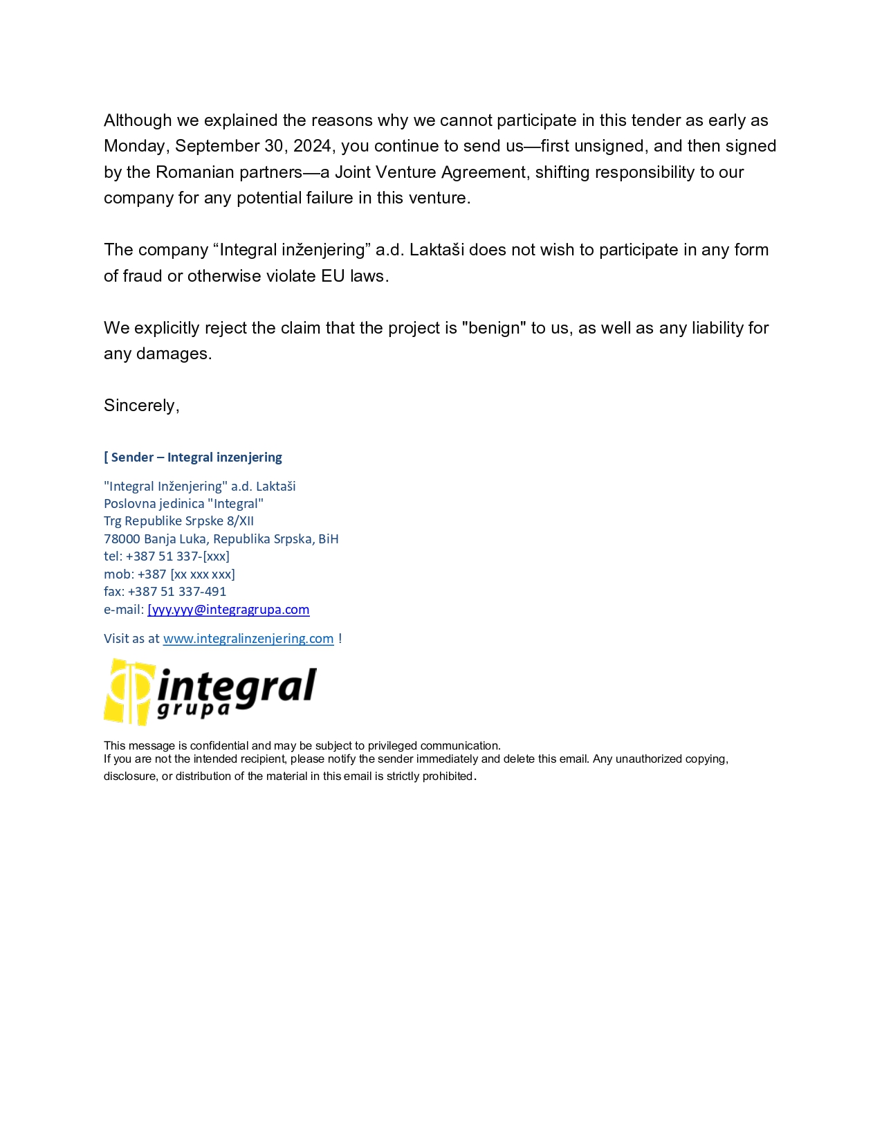Reprezentanții firmei bosniace susțin, conform comunicatului citat, că nu au primit documentația completă necesară pentru ofertare și că li s-ar fi impus un termen de trei zile pentru a analiza și semna documentele, termen considerat nerealist. Integral Inženjering mai arată că a refuzat să semneze retroactiv documentația și că nu dorește să fie implicată în posibile încălcări ale legislației europene, respingând orice răspundere pentru eventuale prejudicii.
