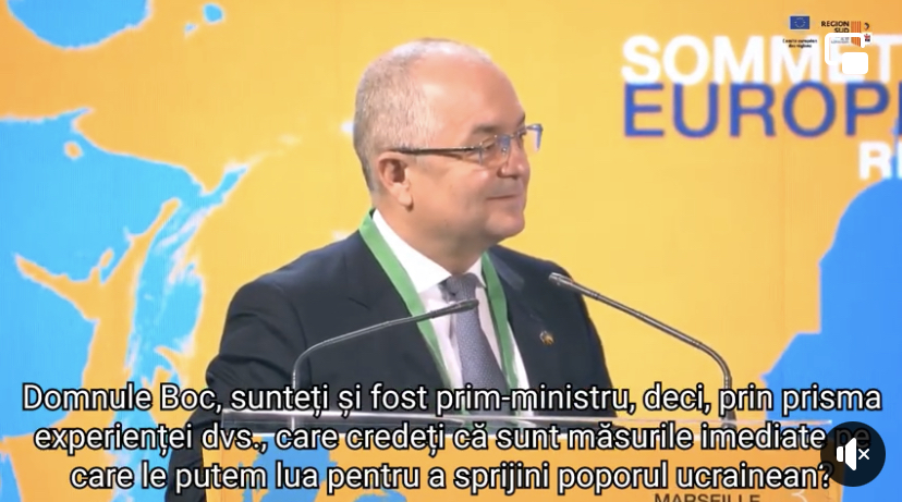 „Partea cea mai grea a acestui război nu a venit încă. Trebuie deci să fim pregătiți pentru mai rău. Acesta nu este un sprint, ci un maraton și avem nevoie de sprijin european pentru următorii pași. Sub coordonarea autorităților și cu sprijinul cetățenilor, momentan situația este sub control, însă vom avea nevoie în viitorul apropiat de mecanismul European de intervenție în caz de urgență. Uniunea Europeană trebuie să aibă o voce puternică și unită. Sunt atât de mândru să fiu european și să fiu parte a acestei voci comune. Este pentru prima dată când Europa demonstrează cât de uniți suntem, iar încrederea cetățenilor în Uniunea Europeană va crește în lunile ce urmează. Fără concesii deci față de domnul Putin! Ce e prea mult e prea mult! (…) Cred că sancțiunile trebuie extinse și asupra Belarusului.Trebuie să sprijinim accelerarea procedurilor de aderare a Ucrainei și a Republicii Moldova la Uniunea Europeană. Trebuie să le trimitem următorul mesaj: nu sunteți singuri deoarece împărtășim cu toții aceleași valori Europene”, a atras atenția primarul Emil Boc, prezent la Summitul European al Orașelor și Regiunilor din Marsilia, Franța.