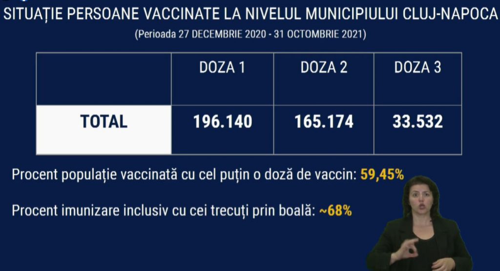 „Vaccinarea funcționează. Suntem la 59,45% persoane vaccinate cu cel puțin o doză. Cea mai înaltă rată de vaccinare din țară. Dacă îl adăugăm și pe cei trecuți prin boală ajungem la aproape 68%. Aceasta arată responsabilitate, maturitate și o populație care înțelege modalitatea prin care se iese din pandemie. Îi felicit pe clujeni că au rămas consecvenți și felicit corpul medical. Drumul nu trebuie să se oprească. Trebuie să mergem mai departe, să atingem ținta de 80-90%, cum sunt alte țari din Uniunea Europeană unde viața aproape a revenit la normal. Sunt convins că împreună vom reusi să fim primii din România care să atingem acest standard european”, a spus primarul Emil Boc la ședința Consiliului Local din 1 noiembrie.