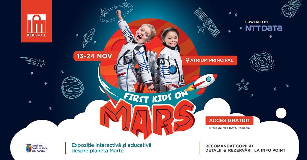 Perioada 13-24 noiembrie 2019 este dedicată micilor exploratori, la Iulius Mall Cluj. Prichindeii sunt așteptați la expoziția interactivă „First Kids on Mars”, unde au ocazia să se distreze și să înveţe despre Univers și despre planeta Marte.