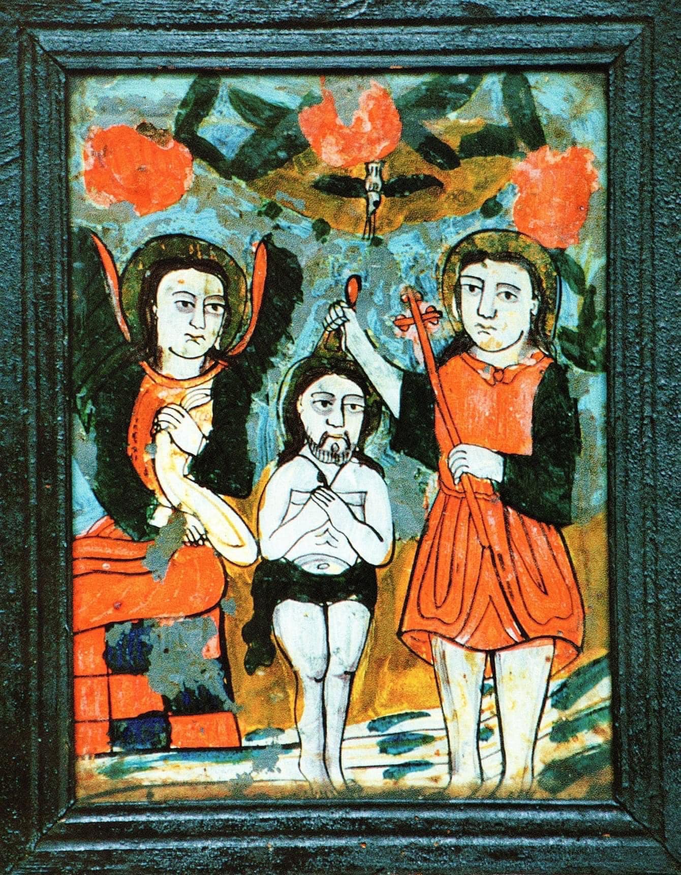 În imagine Botezul Domnului, Icoană pe sticlă- Nicula, jud. Cluj/colecția Muzeului Etnografic al Transilvaniei