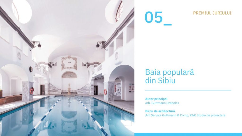 Arhitectura patrimoniului cultural – premiul a fost câștigat de BAIA POPULARĂ SIBIU, Sibiu, autor principal arh. Guttmann Szabolcs, birou de arhitectură Arh Service Guttmann & Comp; K&K Studio de proiectare.