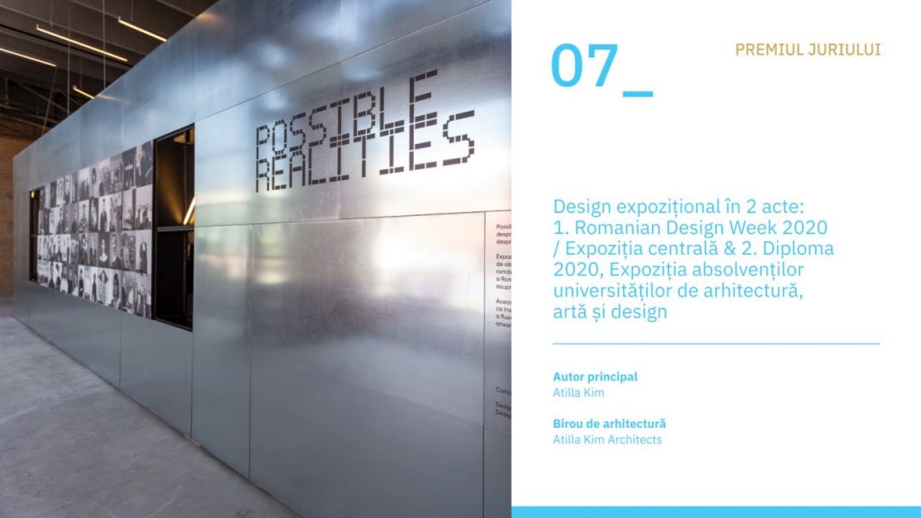 Arhitectura spațiului interior și scenografie – premiul a fost câștigat de Design expozițional în 2 acte: 1. Romanian Design Week 2020 / Expoziția centrală & 2. Diploma 2020, Expoziția absolvenților universităților de arhitectură, artă și design, București, autor principal arh. Attila Kim, birou de arhitectură Attila KIM Architects.