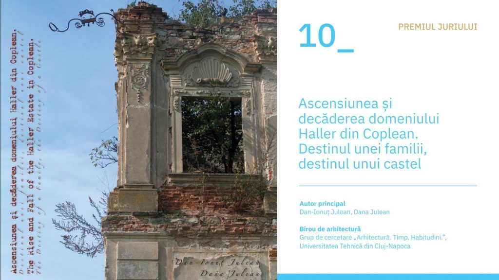 Proiecte culturale/ Inițiative / experimente – premiul a fost câștigat de Ascensiunea și decăderea domeniului Haller din Coplean. Destinul unei familii, destinul unui castel, Cluj-Napoca, Cluj, autor principal Dan Ionuț Julean, Dana Julean, birou de arhitectură Grup de cercetare „Arhitectură. Timp. Habitudini.”, Universitatea Tehnică din Cluj-Napoca.