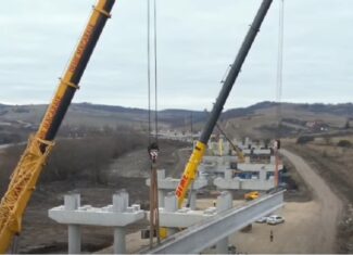 Se montează grinzile la viaductul de pe Autostrada Transilvania din Cluj, aproape 600, cu 370 muncitori