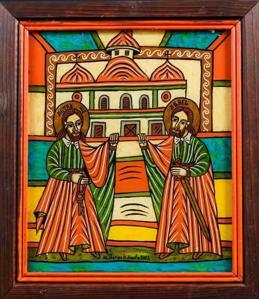 În imagine o icoană pe sticlă – Sfinții Apostoli Petru și Pavel, autor călugărul iconar Ilarion Mureșan de la Mănăstirea clujeană Nicula.