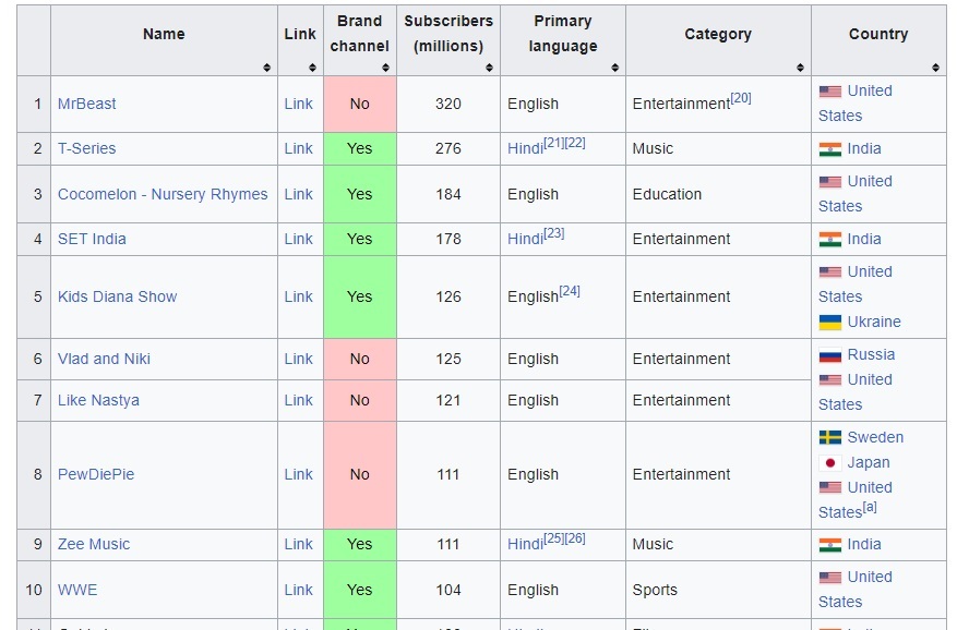 Cele mai populare canale de YouTube după numărul de abonați, cu cifre la 12 octombrie: