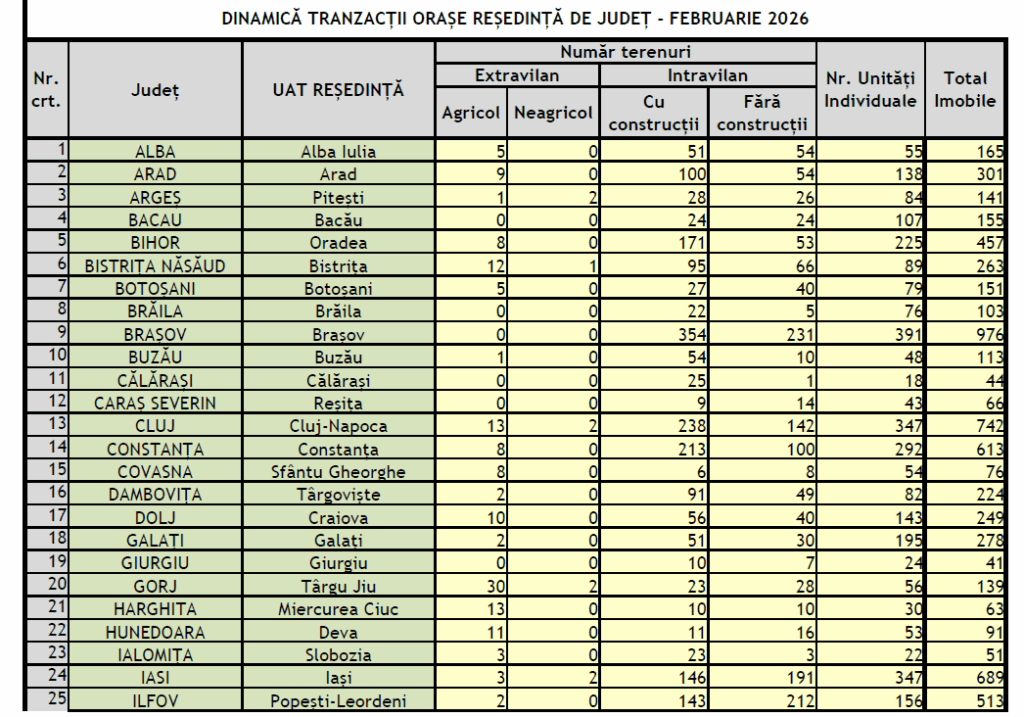 În ceea ce privește reședințele de județ, cele mai multe tranzacții imobiliare au avut loc în Brașov – 976, Cluj-Napoca – 742 și Iași – 689, iar cele mai puține în Alexandria – 9, Giurgiu – 41 și Călărași – 44.