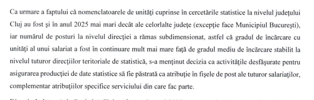Problema e că numărul de angajați nu a crescut pe măsură. Gradul mediu de încărcare a ajuns la 2.421 de unități per salariat în 2025 – în scădere față de 2.635 în 2024, dar tot mult peste media națională. Instituția a ales să mențină activitatea statistică ca atribuție a tuturor angajaților, indiferent de serviciul din care fac parte, pentru a face față volumului.
