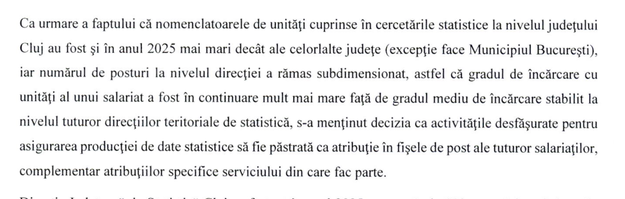 Problema e că numărul de angajați nu a crescut pe măsură. Gradul mediu de încărcare a ajuns la 2.421 de unități per salariat în 2025 – în scădere față de 2.635 în 2024, dar tot mult peste media națională. Instituția a ales să mențină activitatea statistică ca atribuție a tuturor angajaților, indiferent de serviciul din care fac parte, pentru a face față volumului.