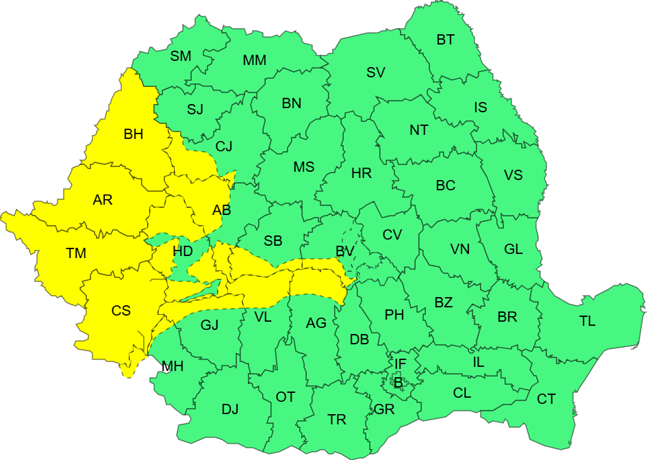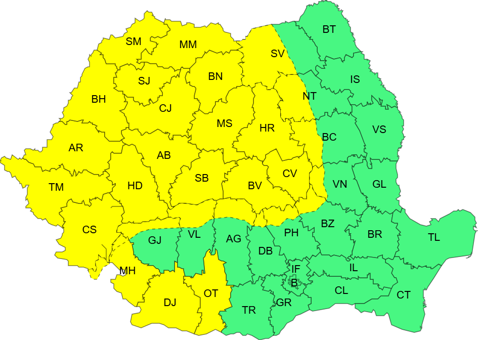 Administrația Națională de Meteorologie a emis azi două avertizări consecutive cod galben de intensificări ale vântului – prima pentru intervalul 23 octombrie ora 21 – 24 octombrie ora 10, adică de diseară până mâine dimineață, și a doua valabilă mâine de la ora 10 la ora 21.