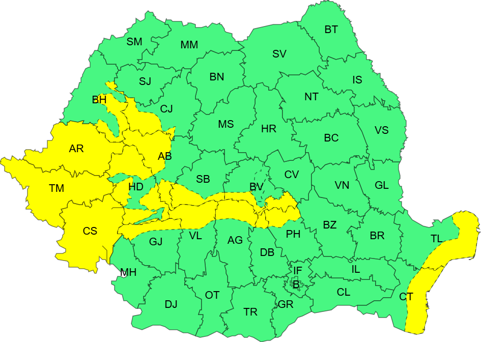 Administrația Națională de Meteorologie a emis în această dimineață o avertizare cod galben de intensificări ale vântului, valabilă din 25 noiembrie la ora 3 până în 6 noiembrie la ora 8; în acest interval în Banat, sudul Crișanei, pe litoral, Carpații Meridionali și Carpații Occidentali meteorologii se așteaptă ca vântul să aibă intensificări cu viteze de până la 65 km/h, iar după-masa zilei de marți și pe litoral, cu viteze de până la 55 km/h. Totodată, în Carpații Meridionali și Occidentali rafalele vor ajunge la 80 km/h, iar la altitudini de peste 1.700 metri vor atinge 110 km/h. Totodată, intensificări ale vântului, cu viteze de până la 50 km/h, sunt așteptate pe arii restrânse și în restul țării.