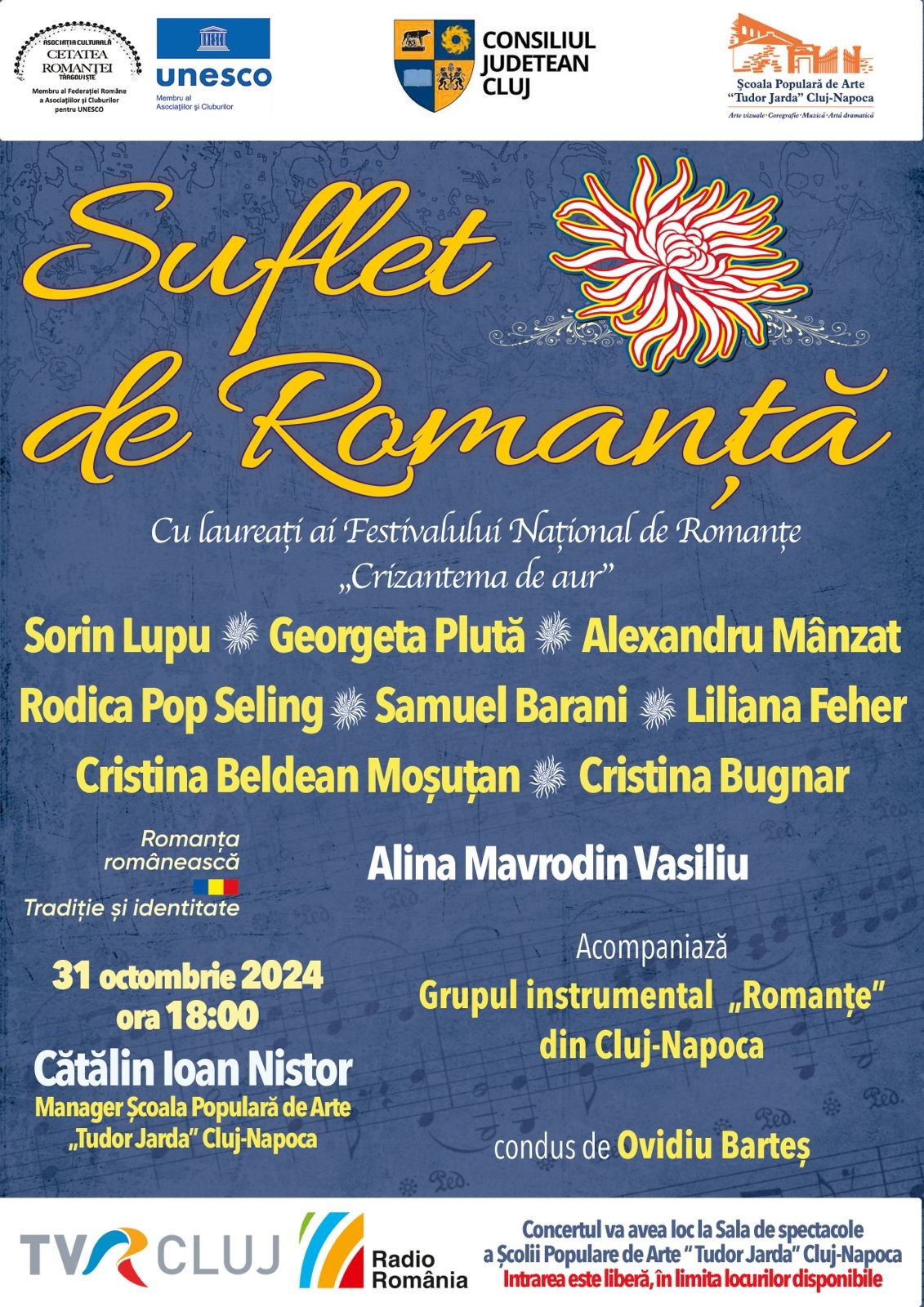 Concertul are loc în sala de spectacole a Școlii Populare de Arte ”Tudor Jarda” din Cluj-Napoca, în 31 octombrie de la ora 18. Este, spun organizatorii, ”un concert de excepție dedicat romanței”. ”Suflet de Romanță” aduce pe scenă unii dintre cei mai apreciați interpreți ai genului, laureați ai prestigiosului Festival Național de Romanțe ”Crizantema de Aur”, alături de invitați speciali – Alina Mavrodin Vasiliu, Rodica Pop Seling, Sorin Lupu, Georgeta Plută, Alexandru Mânzat, Cristina Beldean Moșuțan, Liliana Feher, Cristina Bugnar și Samuel Barani. Atmosfera va fi întregită de Grupul instrumental ”Romanțe”, sub bagheta lui Ovidiu Barteș, iar prezentatoarea serii va fi Alina Mavrodin Vasiliu. Intrarea la concert este liberă.
