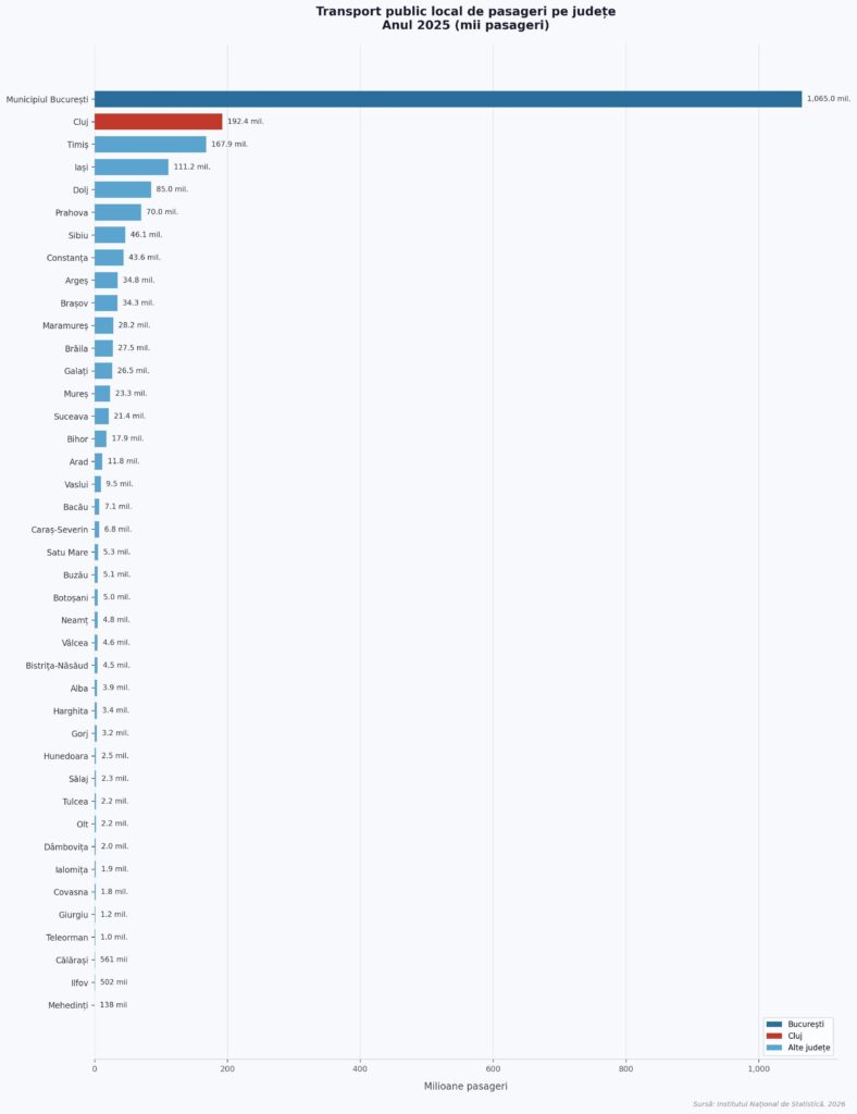 Județul Cluj a înregistrat în 2025 aproape 192,5 milioane de pasageri transportați în rețeaua de transport public local, potrivit datelor publicate de Institutul Național de Statistică. Sunt cei mai mulți pasageri transportați într-un județ din țară în 2025.