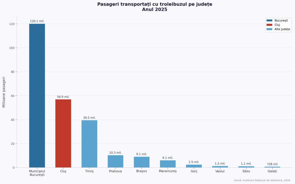 Iese în evidență situația rețelelor de troleibuze: în doar câteva județe sunt în circulație troleibuze iar numărul de pasageri transportați în Cluj e aproape de toate celelalte județe la un loc exceptând Capitala. Iată mai jos cifrele pentru acest criteriu:
