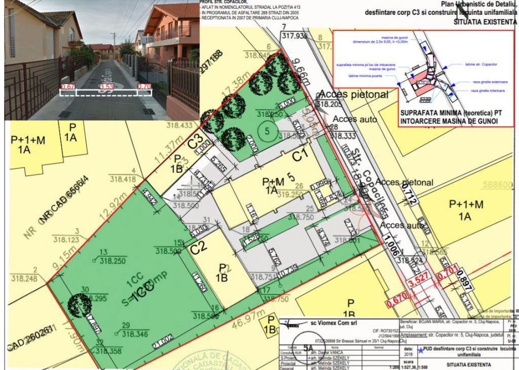 Szekely s-a reîntors cu proiectul la urbanism, în ședința din 11 mai și a prezentat comisiei fotografii cu strada Copacilor. A simulat și o schiță teoretică pentru întoarcerea mașinilor de gunoi, în condițiile în care beneficiarii proiectului ar configura o alveolă. „Întoarcerea este complicată pe teren. Am vorbit și cu firma de salubritate. Ei nu au protocoale pentru locurile de întoarcere. Nici pretenții. Pe strada Copacilor care ste înfundată există la capăt un T unde întorc mașinile mici. Ca să facem o alveolă ar luat foarte mult din parcela beneficiarilor și nu ar rezolva nimic”, a spus proiectanta.
