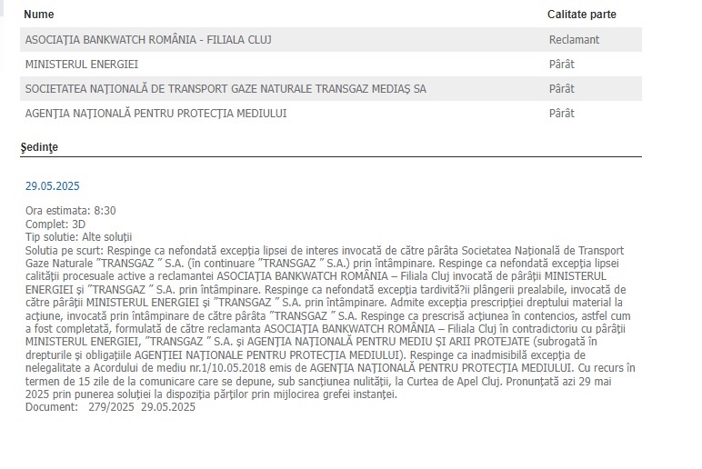 ”Am câștigat, din nou. Pentru securitatea energetică a României, pentru energie românească mai multă, mai sigură și mai ieftină. În mandatul meu, am reușit să câștigăm toate litigiile majore împotriva marilor proiecte energetice. Așa se explică disperarea unora și altora, pentru că le deranjăm interesele proprii — și, mai ales, ale “părților interesate” de la vedere și din umbră”, a arătat Burduja ieri după ce Curtea de Apel Cluj a respins pe fond acțiunea introdusă de asociația Bankwatch România împotriva Ministerului Energiei, Transgaz și Agenției Naționale pentru Arii Naturale Protejate. ”Sentința confirmă că acțiunea introdusă de asociație este prescrisă, deși asociația a formulat mai multe plângeri prealabile către Minister, la intervale diferite de timp, cu același obiect (copy-paste), în speranța de a rămâne în termen și a putea bloca oricând proiectul energetic prin introducerea acțiunii. Excepția de nelegalitate invocată de Banckwatch a fost și ea declarată inadmisibilă”, spune el.