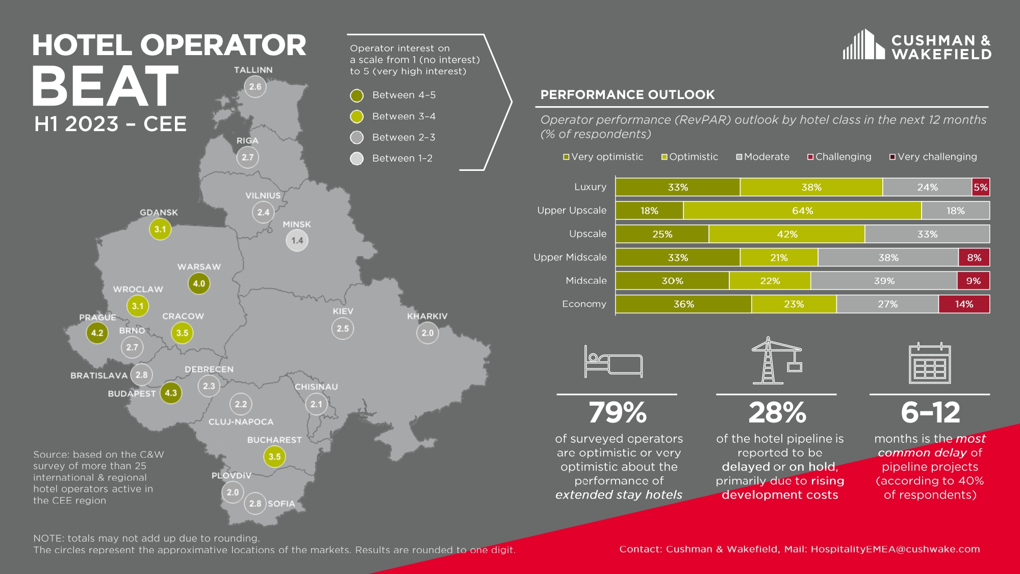 Compania de consultanță imobiliară Cushman & Wakefield a publicat rezultatele studiului Hotel Operator Beat S1 2023, pe baza unui sondaj realizat în rândul a peste 26 de directori executivi ai operatorilor hotelieri deja prezenți în ECE – Belarus, Bulgaria, Republica Cehă, Estonia, Ungaria, Letonia, Lituania, Moldova, Polonia, România, Slovacia și Ucraina – sau interesați să intre în regiune și care operează peste 450 de hoteluri cu peste 72.000 de camere. De asemenea, operatorii intervievați au în curs de pregătire 140 de hoteluri, cuprinzând în total peste 22.000 de camere. Cele mai atractive cinci piețe din regiune pentru operatori sunt, în ordine, Budapesta, Praga, Varșovia, Cracovia și București. Pe lângă București, operatorii și-au mai exprimat interesul pentru Cluj-Napoca și, totodată, pentru destinațiile de pe litoral și stațiunile românești, fapt ce subliniază atractivitatea României și în afara orașelor principale, arată raportul.