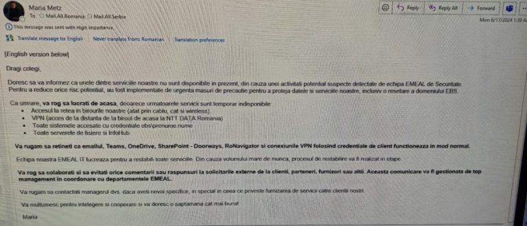 Un grup de hackeri a reușit să penetreze sistemele informatice ale companiei NTT Data România și a anunțat că a sustras 230 de giga de … Continuă lectura Doru Șupeală: Criză la NTT Data România: hackerii au furat 230 de giga de date, iar sistemele informatice ale firmei s-au prăbușit