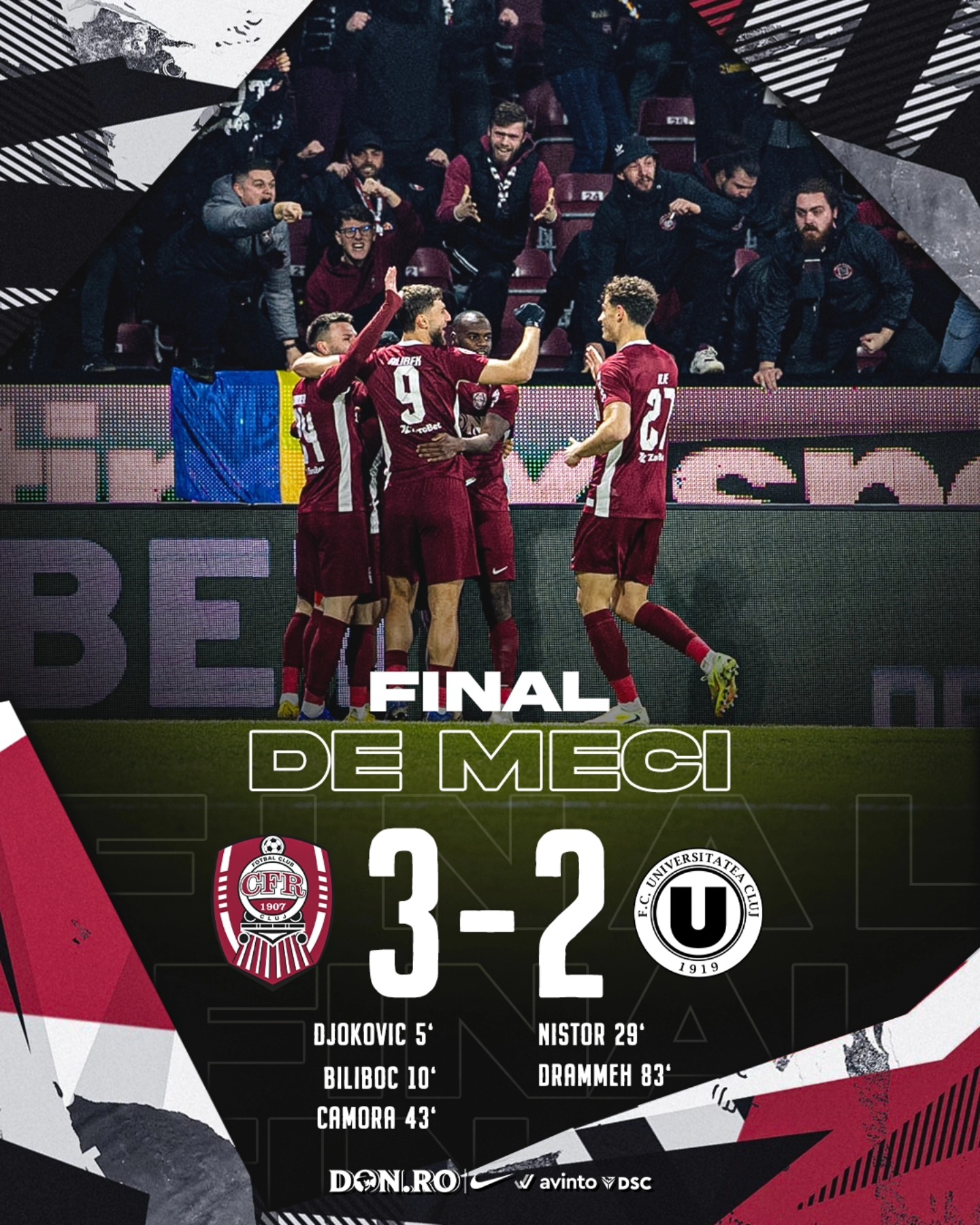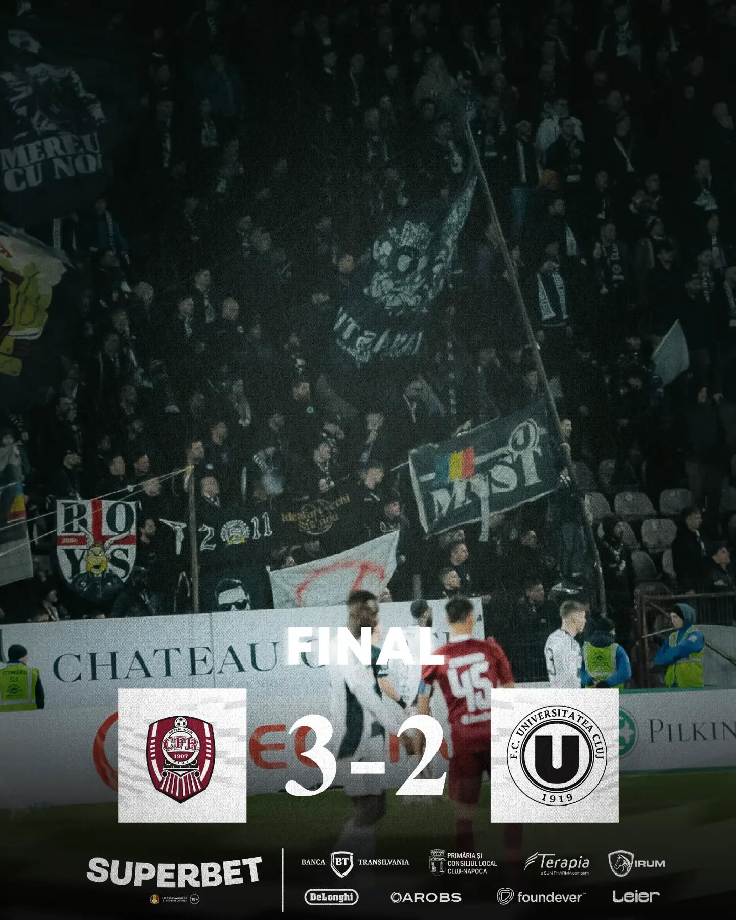 Final de meci în derby-ul Clujului în această seară între CFR Cluj și Universitatea, în Gruia, gazdele înving, 3-2.