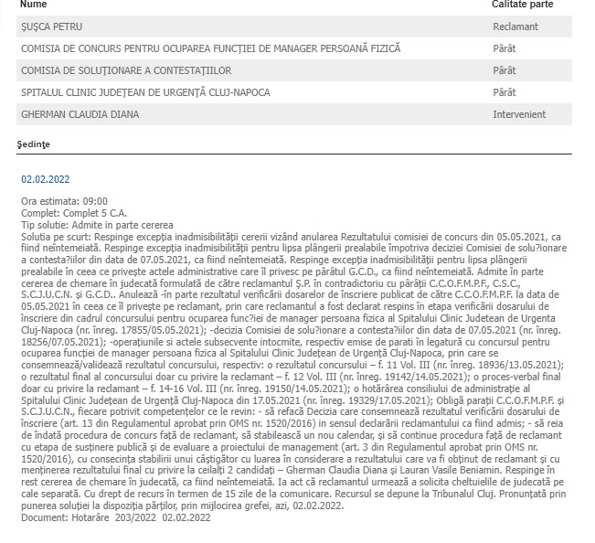Tribunalul Cluj a anulat în parte rezultatul verificărilor dosarelor de înscriere pentru concursul de manager al spitalului județean din Cluj, care a avut loc în 5 mai anul trecut. ”Anulează -în parte rezultatul verificării dosarelor de înscriere publicat de către Comisia de Concurs la data de 5 mai 2021 în ceea ce îl priveşte pe reclamant, prin care reclamantul a fost declarat respins în etapa verificării dosarului de înscriere din cadrul concursului pentru ocuparea funcției de manager persoană fizică al Spitalului Clinic Județean de Urgență Cluj-Napoca”, se arată în decizia instanței.