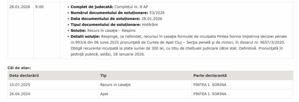 Fostul ministru al Sănătății Sorina Pintea rămâne cu pedeapsa de 3 ani și 6 luni de închisoare pentru luare de mită dată la Cluj, după ce Instanța supremă i-a respins ieri o cerere de recurs în casație, o cale extraordinară de atac prin care aceasta a încercat să obțină anularea condamnării de la Curtea de Apel Cluj.