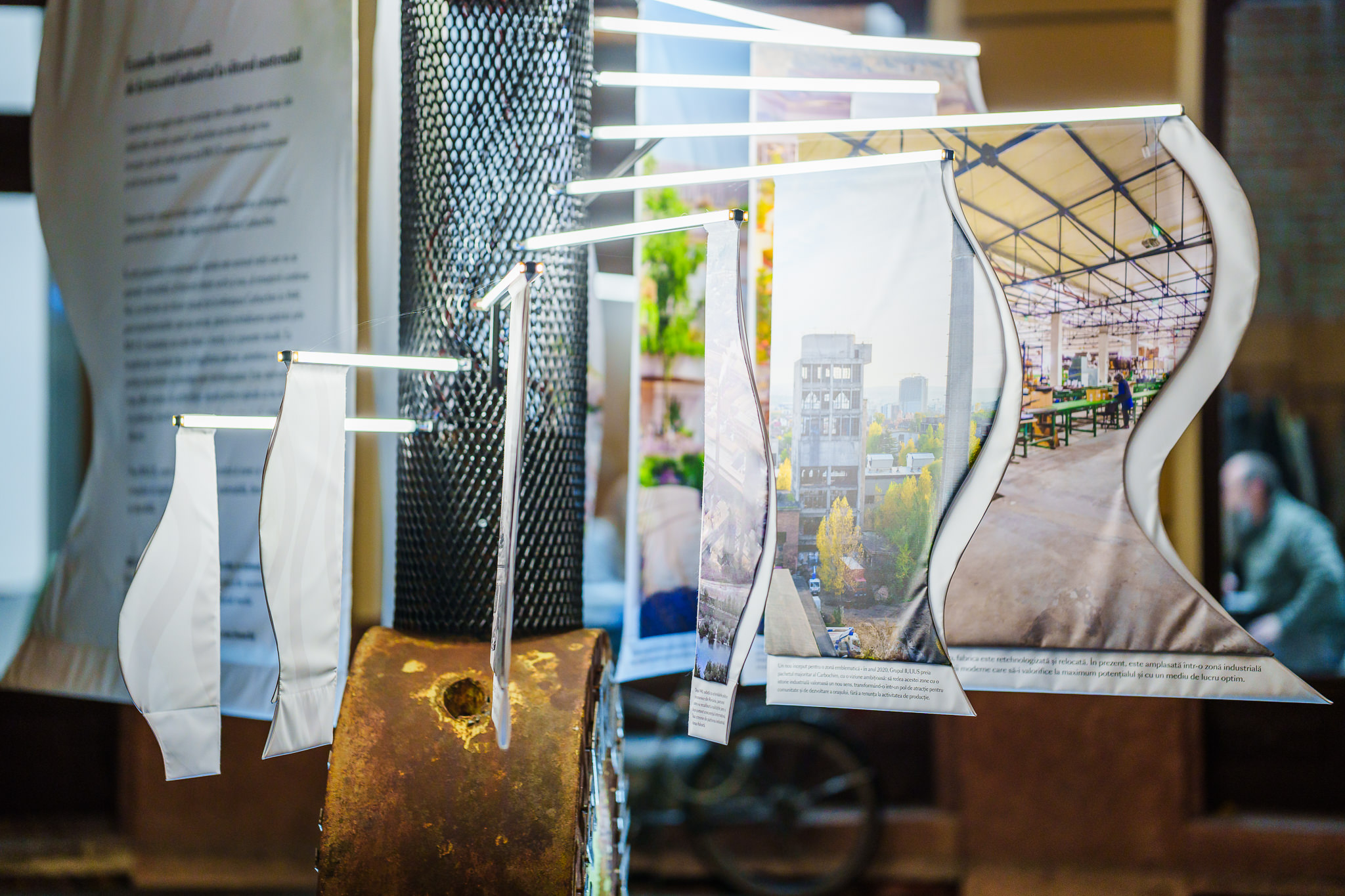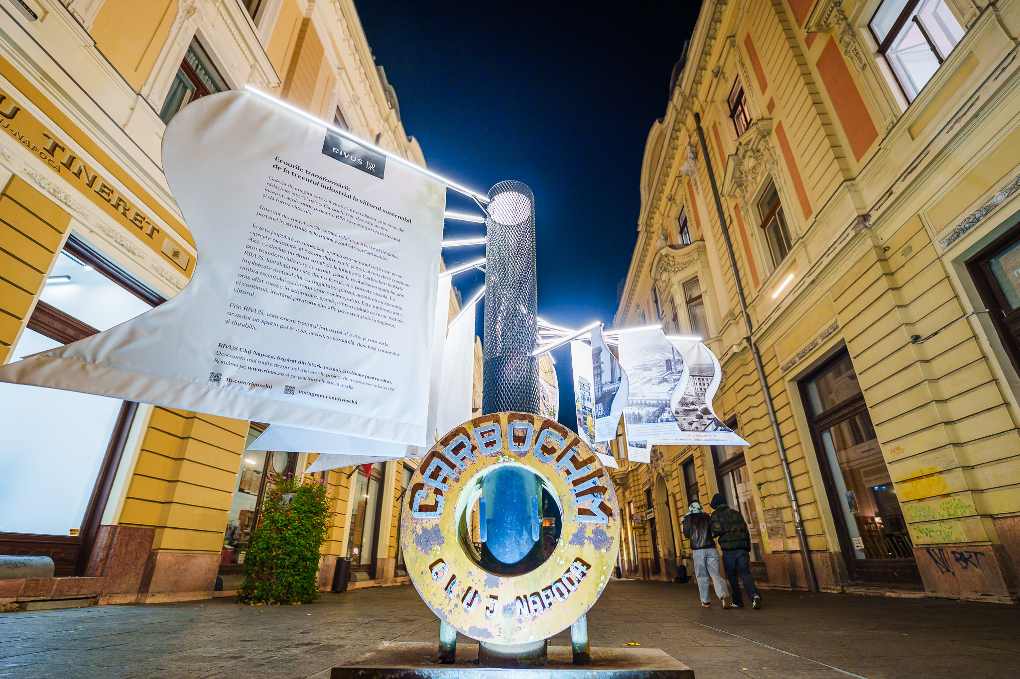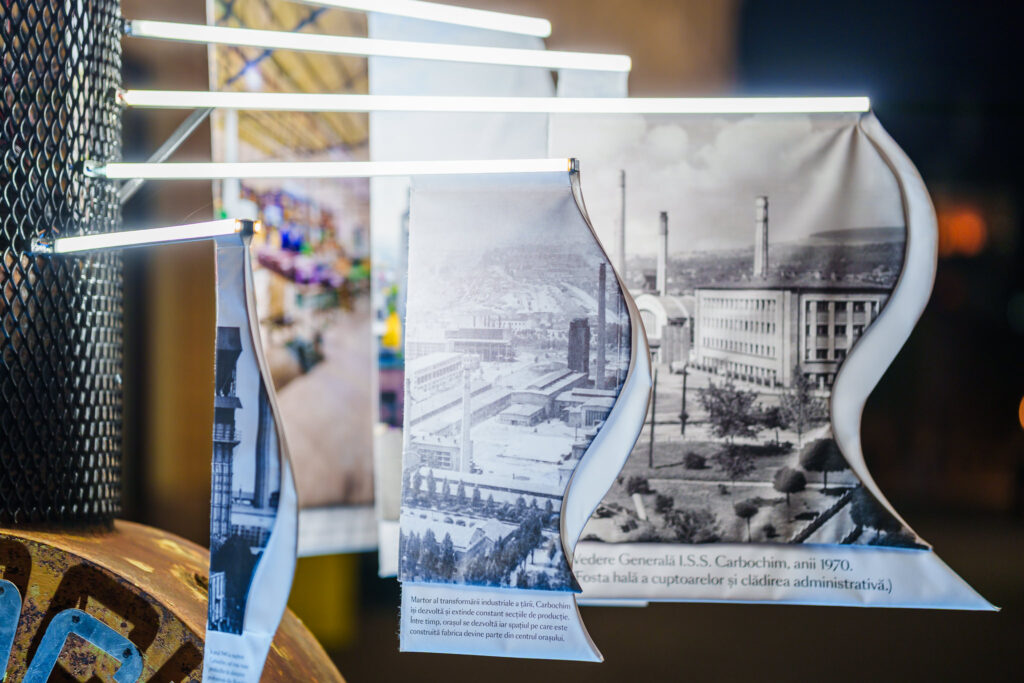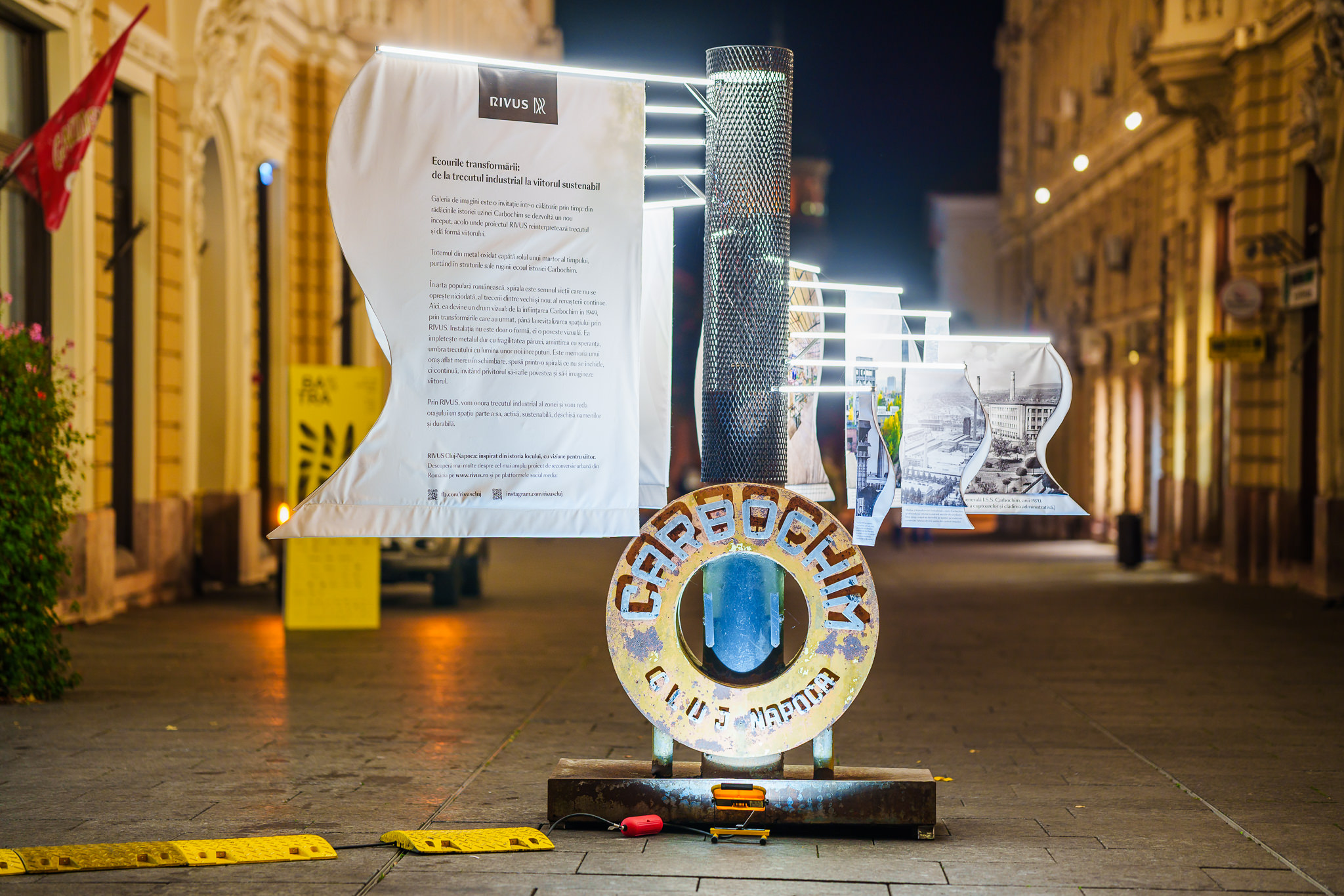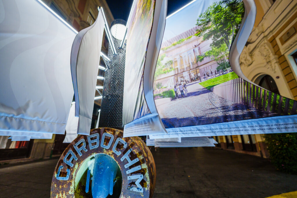Instalația care reprezintă proiectul de reconversie a platformei Carbochim vorbește despre transformare, memorie și renaștere urbană. Mai precis, include o galerie de imagini, care marchează trecerea simbolică de la istoria industrială a uzinei Carbochim către noua etapă de dezvoltare, reprezentată de RIVUS, cel mai amplu proiect de reconversie urbană din România.