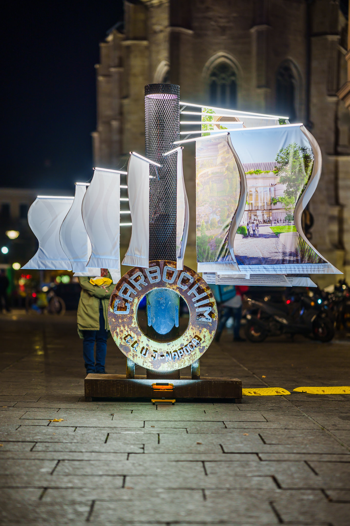 FOTO Cum se vede instalația RIVUS noaptea, în centrul Clujului / Mai poate fi vizitată, în cadrul BATRA, inclusiv duminică 26 octombrie, apoi va fi mutată la intrarea în Iulius Mall