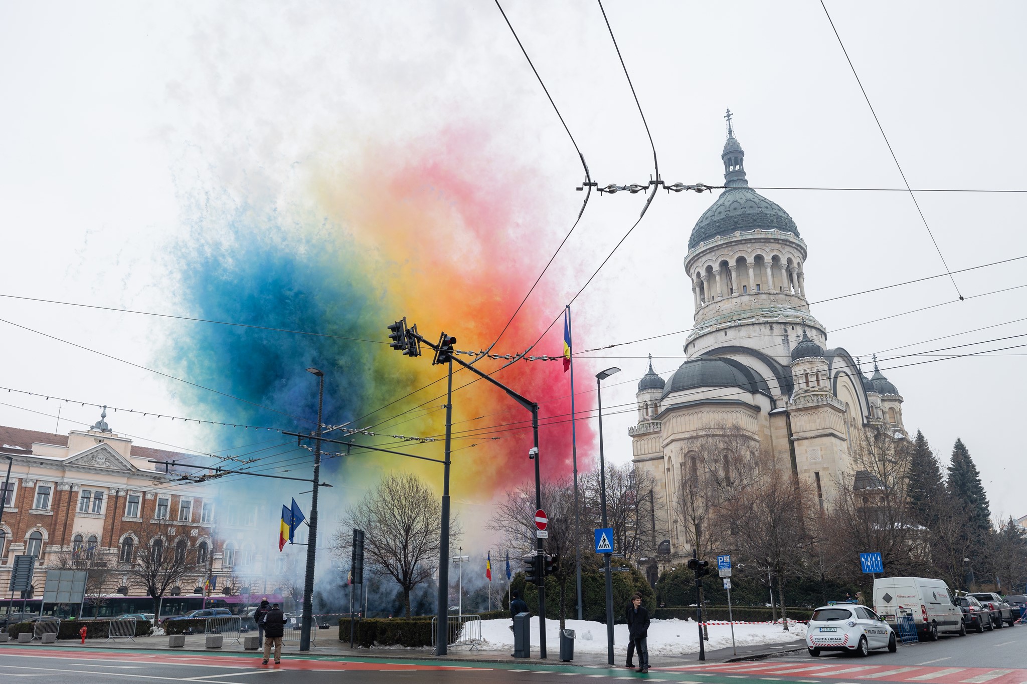 Evenimentul s-a încheiat cu un scurt foc de artificii de zi, în culorile drapelului României, transformând centrul Clujului într-un simbol al solidarității comunității.