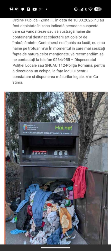 Deși problema este cunoscută la nivelul administrației locale, clujenii spun că măsurile luate până acum nu au reușit să o elimine, iar astfel de incidente continuă să apară în mai multe cartiere. În unele zone, situația pare să se fi agravat, containerele fiind deteriorate frecvent, iar hainele ajung împrăștiate în spațiul public.