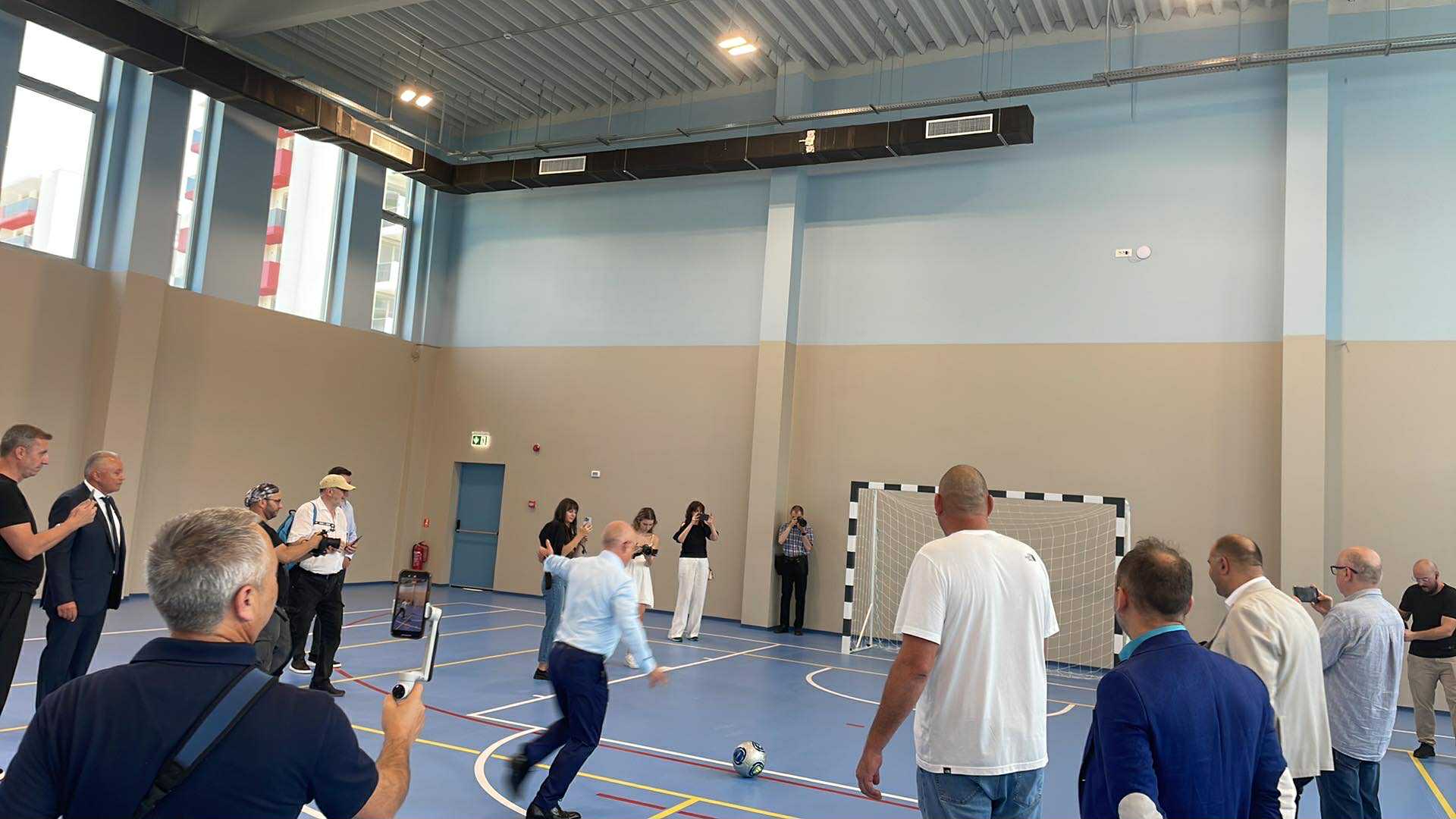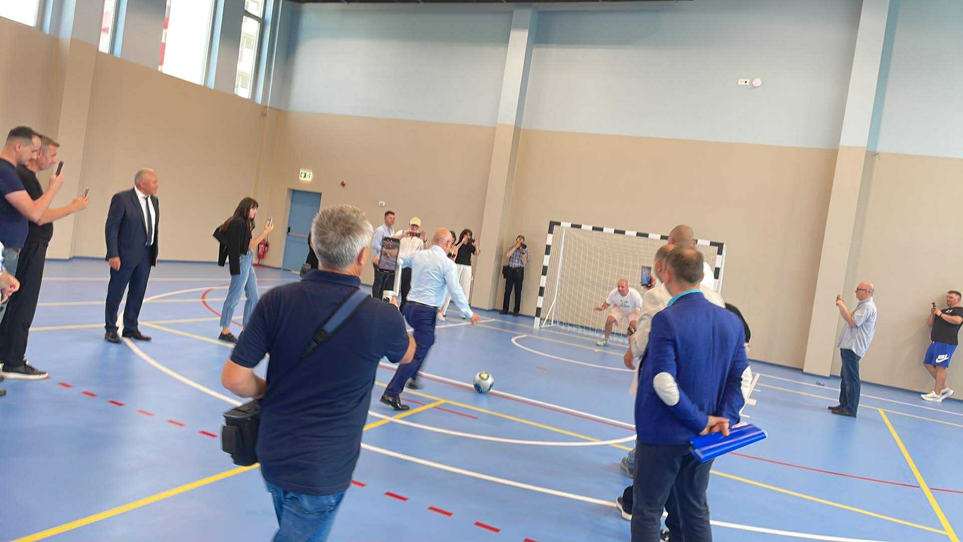 În cadrul vizitei, primarul Emil Boc a testat și sala de sport unde a șutat la poarta apărată de ziariști din Cluj.
