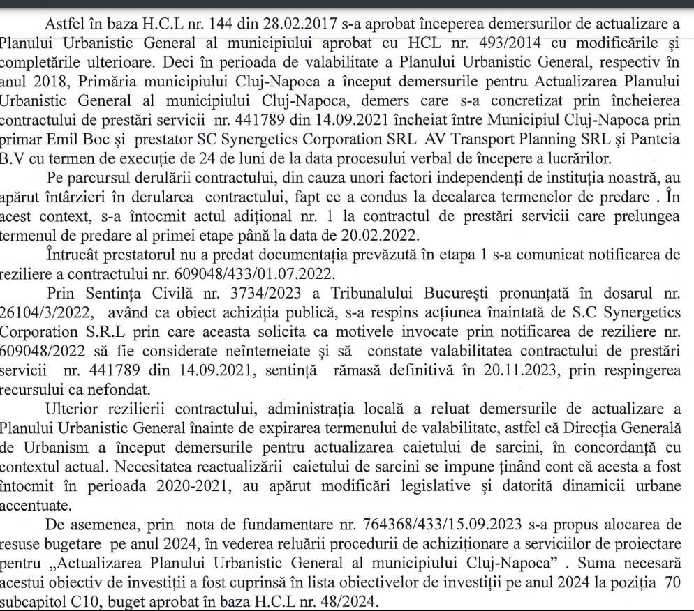 De fapt, de la reziliere, primarul Emil Boc a ținut să transmită că în ciuda rezilierii nimeni din oraș nu e în pericol să nu mai poată construi deoarece PUG Cluj expira în decembrie 2024 iar Primăria poate, legal, să îl mai prelungească încă 10 ani.