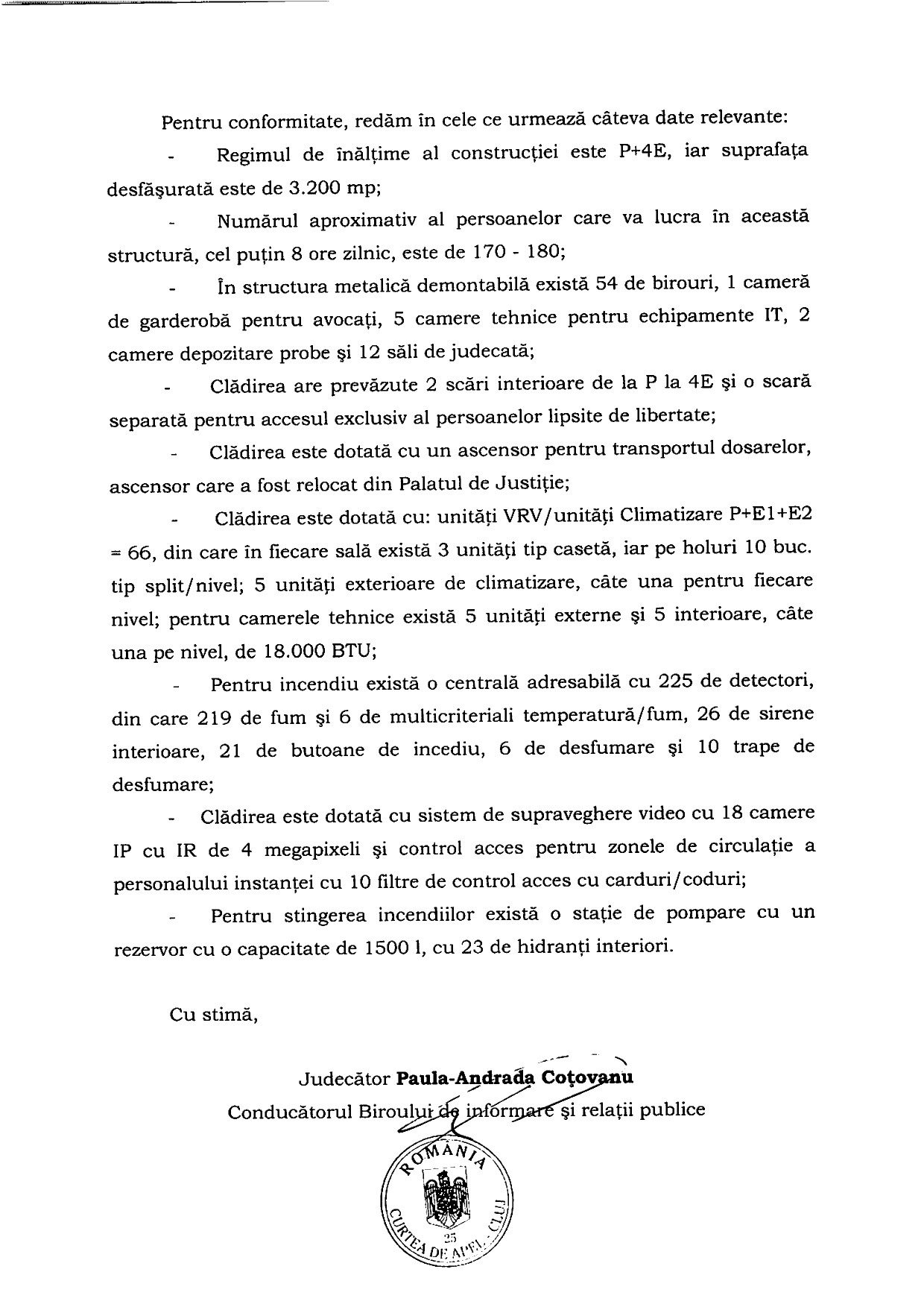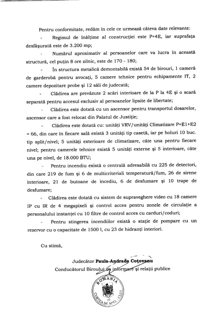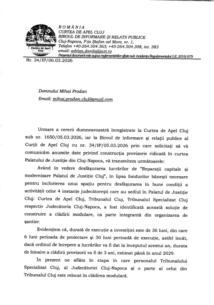 ”În prezent ne aflăm în etapa în care personalul Tribunalului Specializat Cluj, al Judecătoriei Cluj-Napoca şi o parte al celui din Tribunalul Cluj este relocat în clădirea modulară”, arată aceasta.
