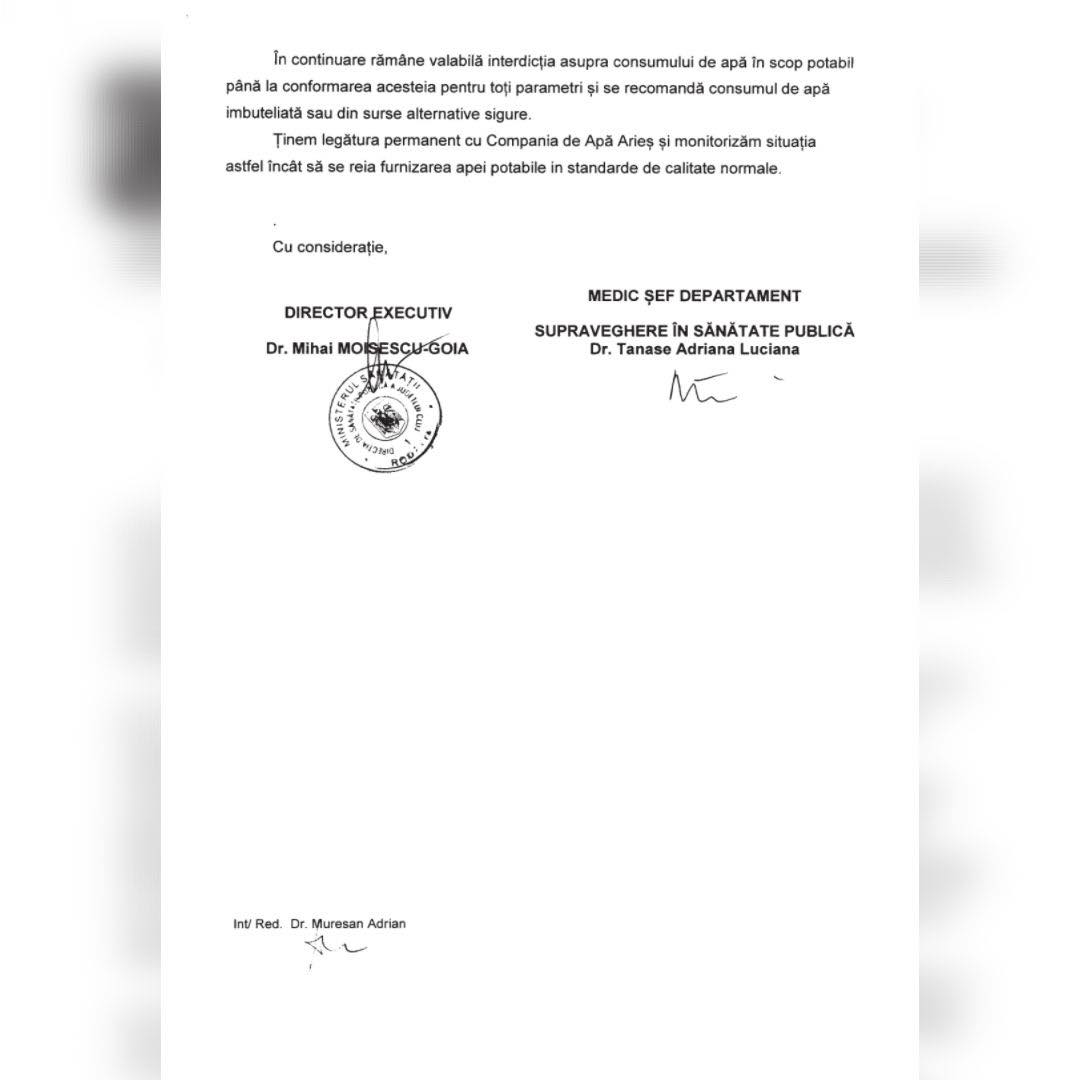 Astfel, probele analizate ieri au relevat că turbiditatea în zonă rămâne ridicată, astfel Direcția de Sănătate Publică arată că rămâne valabilă interdicția asupra consumului de apă în scop potabil până la conformarea acesteia pentru toți parametrii și se recomandă consumul de apă îmbuteliată sau din surse alternative sigure.
