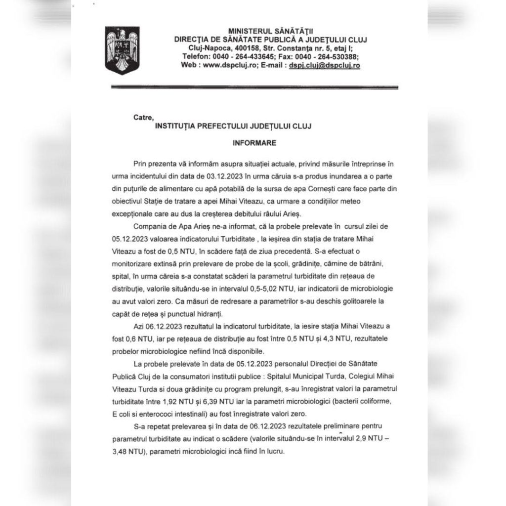 Compania de Apă Arieș a anunțat în urmă cu patru zile că furnizarea apei potabile a fost afectată de creșterea debitului râului Arieș, determinată la rândul său de inundații. ”Vă rugăm să folosiți apa de la robinet doar în scopuri menajere”, transmitea în 3 decembrie Compania de Apă consumatorilor din zona Turzii. ”Ca urmare a condițiilor meteo excepționale ce au determinat creșterea debitului râului Arieș au fost afectate o parte din puțurile de alimentare cu apă potabilă din zona Mihai Viteazu, fronturi de captare din care este furnizată apa potabilă către municipiul Turda. Echipele de intervenție s-au deplasat în mai multe zone din municipiu și au constatat ca unul din parametrii de analiză ai apei, mai exact turbiditatea, a crescut semnificativ. În consecință, au fost oprite fronturile de captare afectate și în momentul de față alimentarea cu apă potabilă se realizează din surse alternative”.