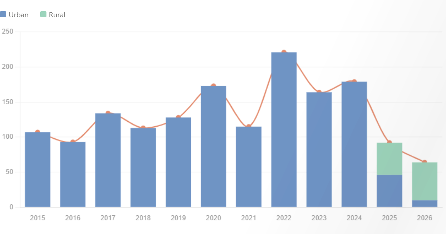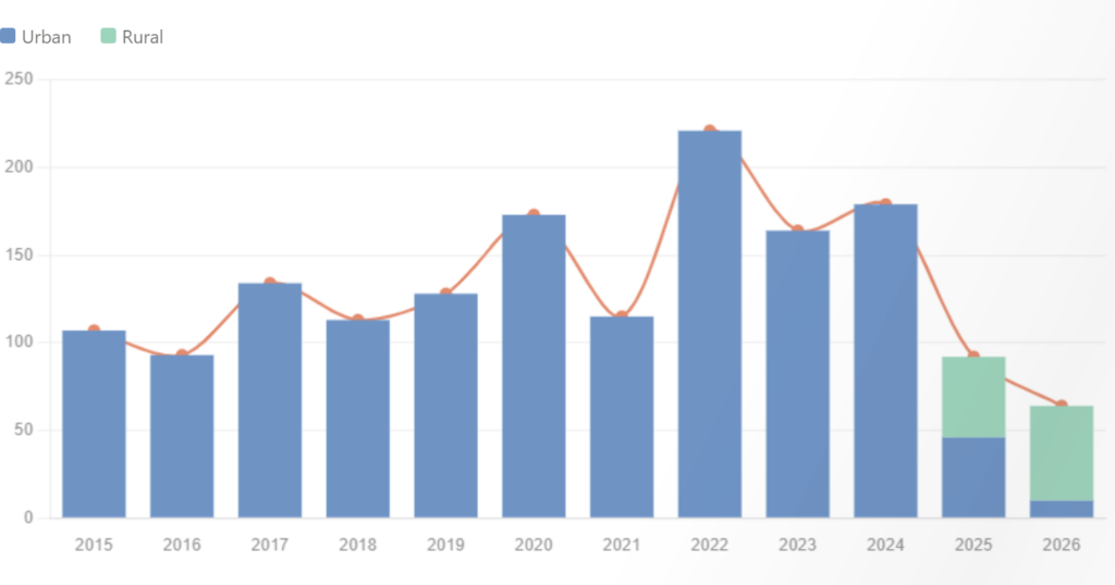 Această dinamică inversă sugerează că presiunea imobiliară s-a mutat în afara orașelor, posibil pe fondul prețurilor ridicate din Cluj-Napoca și al disponibilității terenurilor în localitățile din jur – comuna Florești din vecinătate a devenit în acest mod cea mai mare din România, numărul locuitorilor a crescut cu 50.000 în 20 de ani. Cumulat de la începutul anului, județul a emis 136 de autorizații rezidențiale, față de 159 în primele două luni din 2025, o scădere de 14,5%. Decalajul urban-rural se menține și pe această perioadă: urbanul a coborât de la 71 la 28 de autorizații, în timp ce ruralul a urcat de la 88 la 108.
