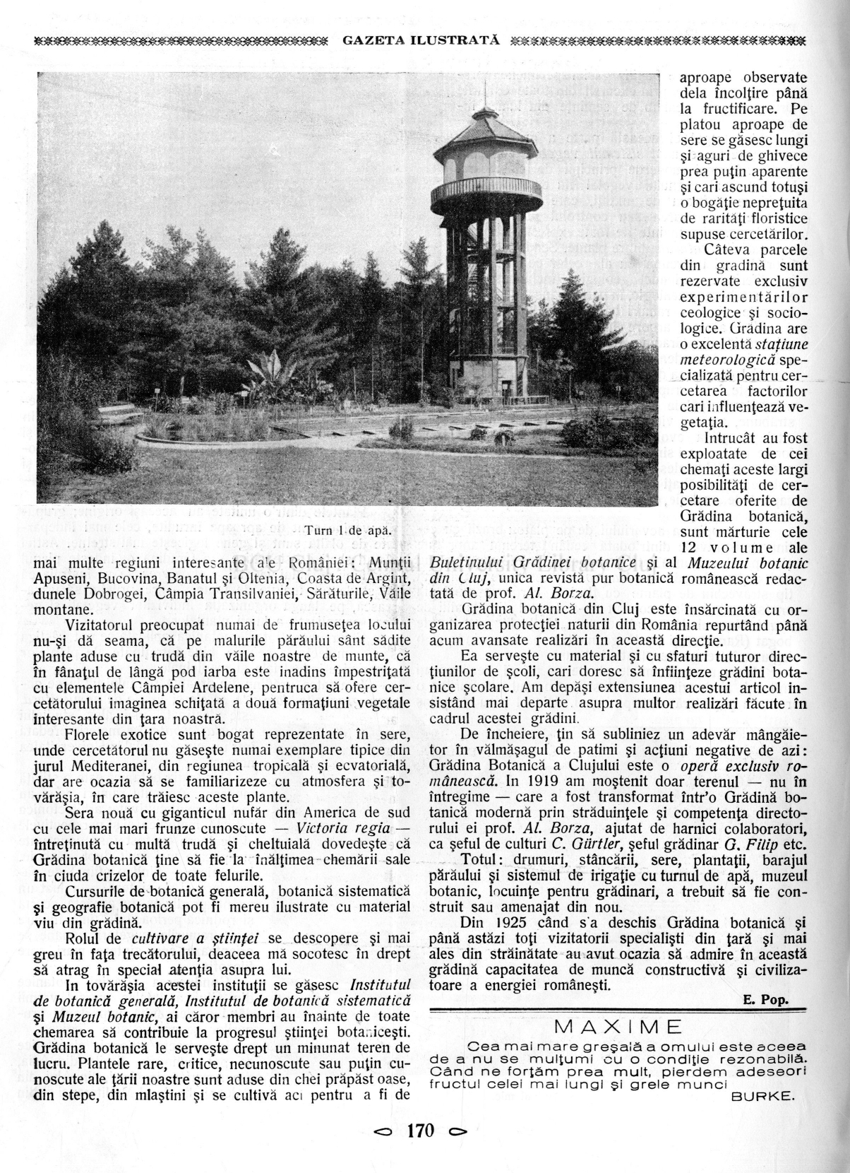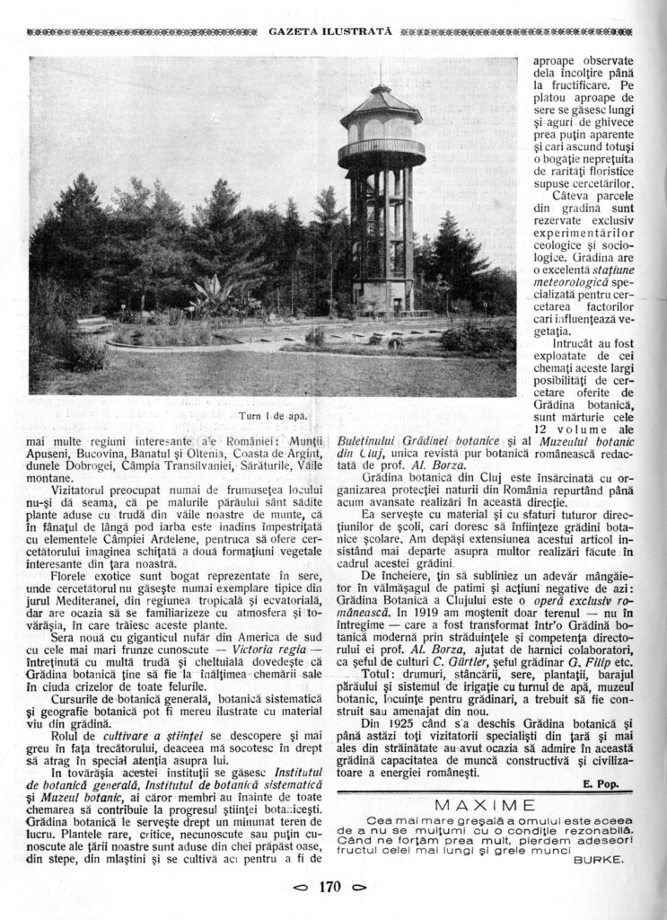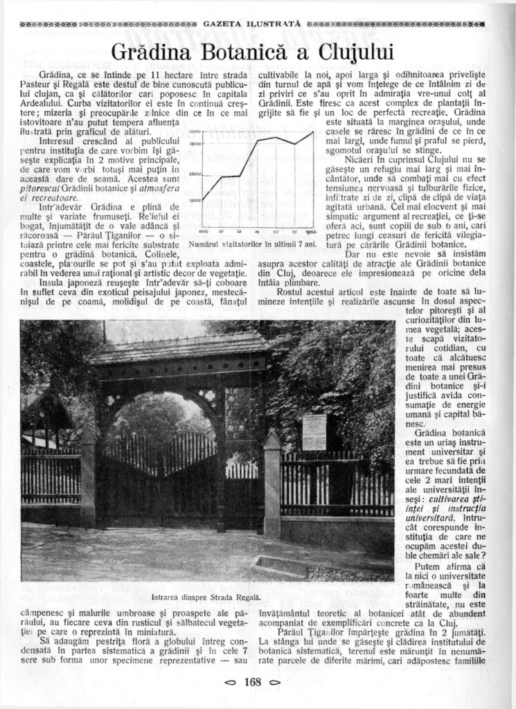 La câțiva ani de la deschiderea din 1925 un alt reportaj arăta că nu găsești în oraș un refugiu mai bun pentru tensiunea nervoasă. ”Nicăeri în cuprinsul Clujului nu se găseşte un refugiu mai larg şi mai încântător, unde să combaţi mai cu efect tensiunea nervoasă şi tulburările fizice, infiltrate zi de zi, clipă de clipă de viaţa agitată urbană”, arată reportajul. Acesta a fost publicat într-un număr din Gazeta Ilustrată din 1932, la câțiva ani după deschiderea grădinii botanice din Cluj.