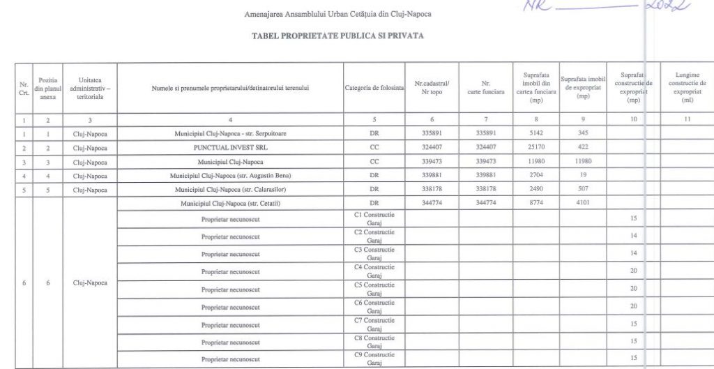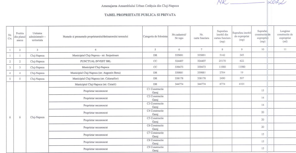 Primăria declanșează procedura de expropriere pentru terenurile care fac parte din proiectul de modernizare al Cetățuii, dealul de belvedere al Clujului. Potrivit unui proiect de hotărâre care va fi discutat de consilierii locali la ședința ordinară din 2 noiembrie, din perimetrul de peste 14 hectare care va fi supos modernizării, urmează să se exproprieze peste 3,5 hectare de teren plus peste 12.000 de metri pătrați de construcții (garaje, ziduri de sprijin etc). Valoarea totală a despăgubirilor propuse de firma contractată de municipalitate, Expertus, este de peste 35,2 milioane lei (sumă compusă din valoarea de piață a terenurilor expropriate și un prejudiciu cauzat fiecărui proprietar afectat).