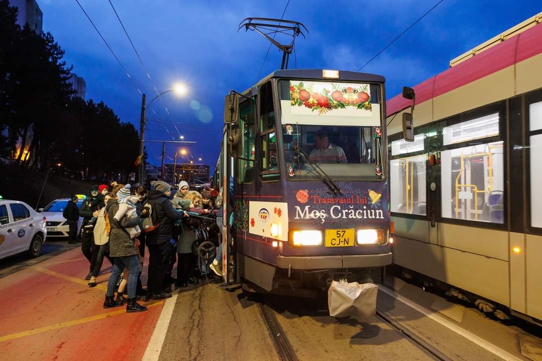 Tramvaiul lui Moș Crăciun circulă în continuare la Cluj-Napoca până marți, 26 decembrie. Copiii îl pot întâlni pe Moșul în fiecare zi de la ora 15 pe traseul liniei 102, într-un decor de sărbătoare.