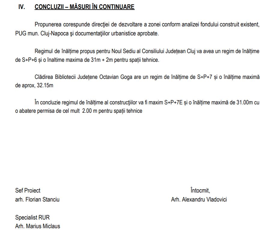 Viitorul sediu al Consiliului Județean urmează să aibă șase etaje și va avea un nivel mai puțin față de cel al clădirii Bibliotecii Octavian Goga. De asemenea, proiectanții recomandă și reorganizări ale regimului de proprietate, propunând ca Județul să primească în proprietate o serie de suprafețe de teren de la Primărie.